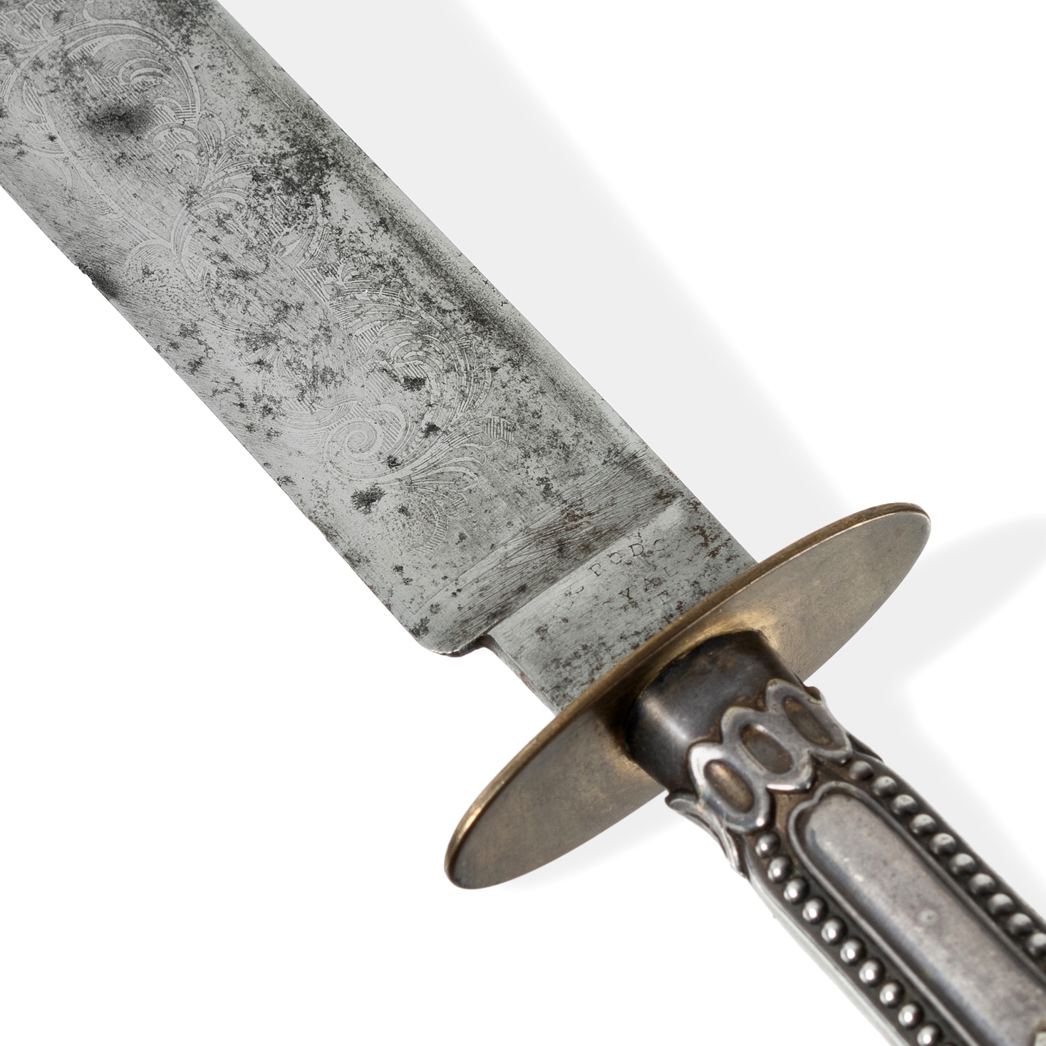 Good 19th C Sheffield Bowie Clip point blade with false edge. Faint etched motto 'Sure Defence'. Maker's mark worn '[... Rodgers, [Ro]yal...Sheffield]' silver cutlery hilt. Original faux lizard skin scabbard. (L33cm) PROVENANCE: From the collection of the late Warren MallardEstimate $400-800
