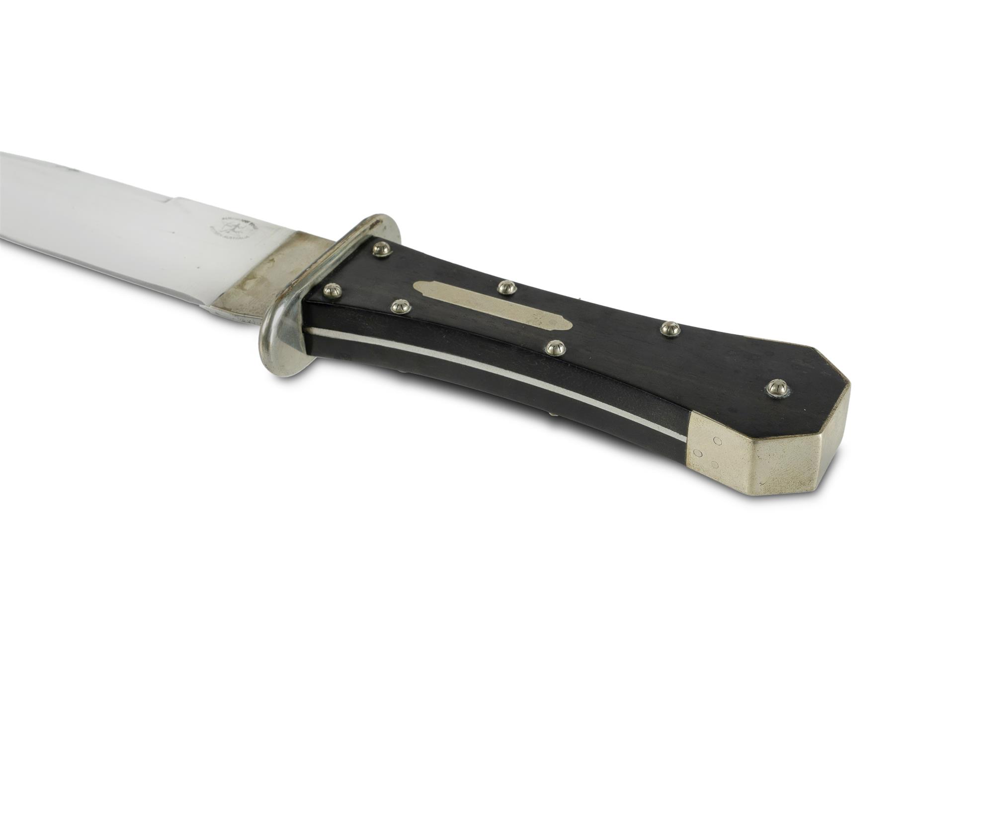 Handmade Custom 'Bushmans Edge' Replica Bowie Knife Jim Steele. Clip point with false edge. Ebony slab grips with nickel mounts on a coffin shaped hilt. With leather scabbard. (L29cm) PROVENANCE: From the collection of the late Warren MallardEstimate $100-300
