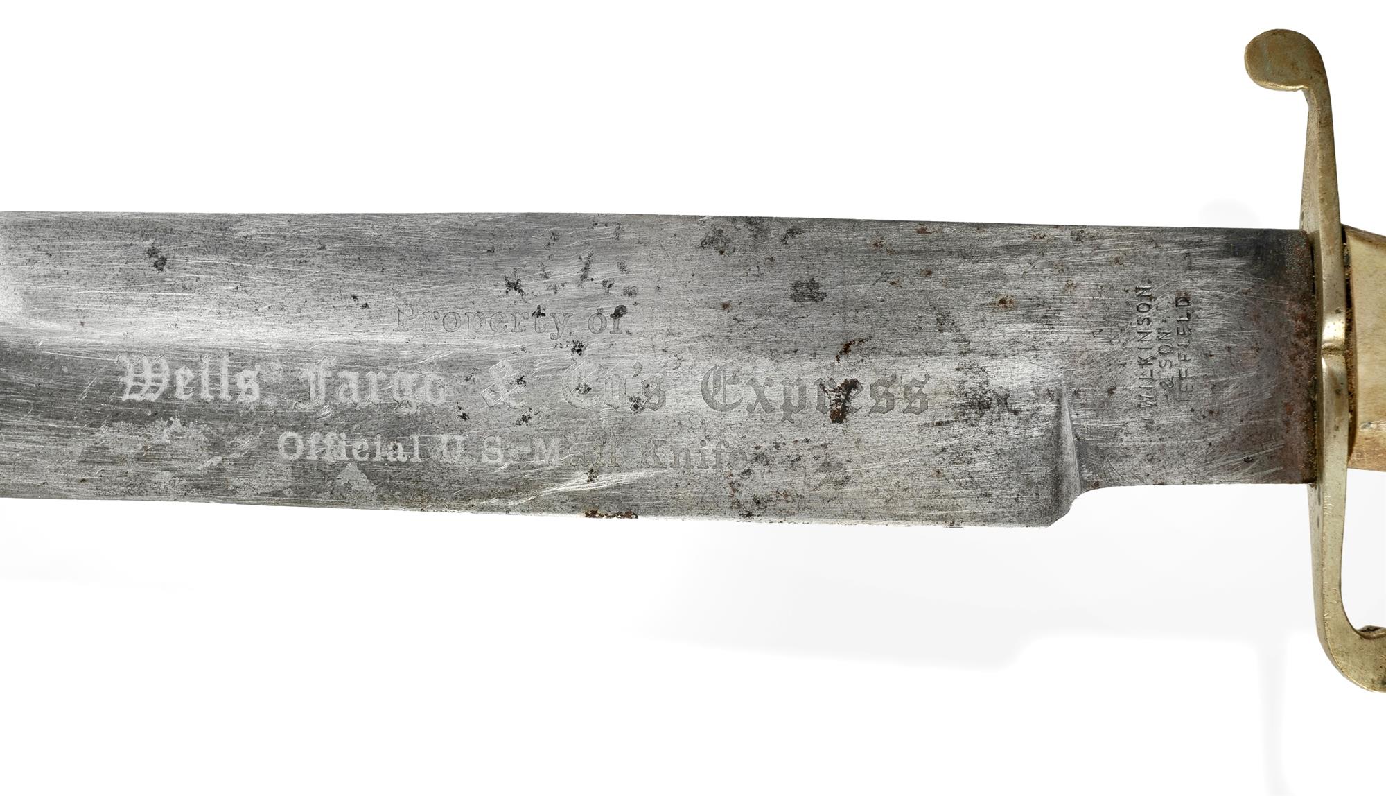 20th C Wells Fargo Commemorative Bowie Knife Large clip point blade, etched inscription 'Property of Wells Fargo & Co's Express, official US mail knife'. Stamped maker's mark 'Wilkinson & Son Sheffield'. Brass guard, and staghorn hilt with nickel silver pommel. (L44cm)
