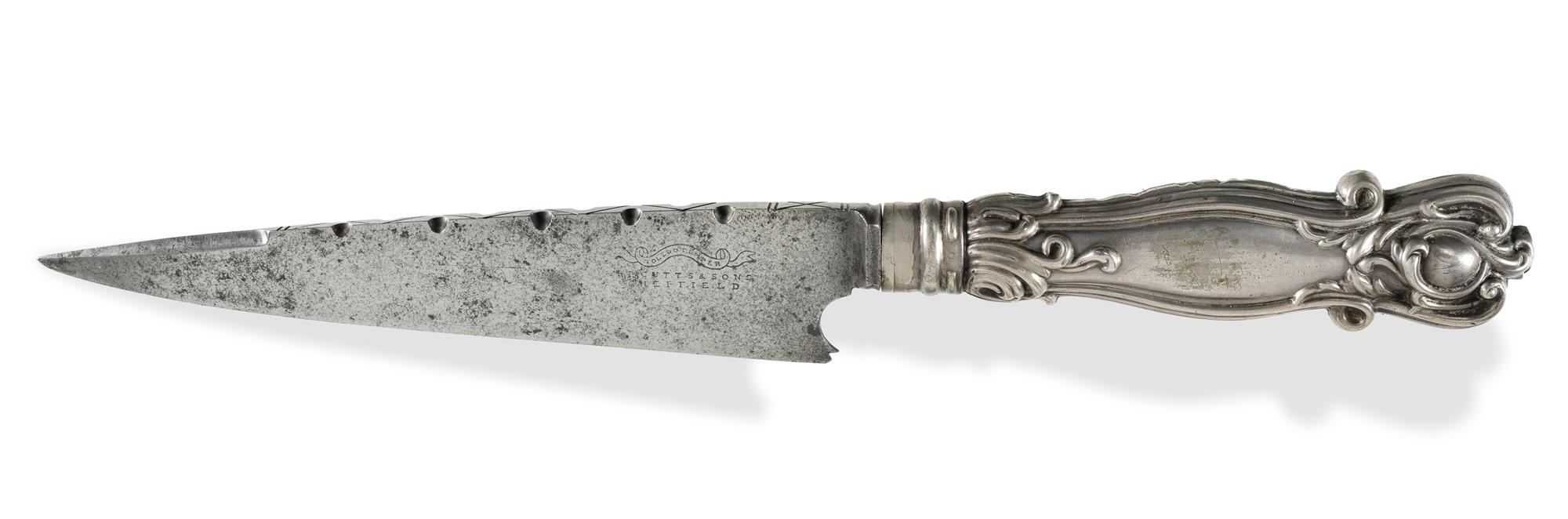 Large Mid 19th C Gaucho Knife I.P. Cutts & Sons, Sheffield. Large silver plated cutlery style grip with some slight wear and bumps. The blade marked 'Toledo Temper, I.P. Cutts & Sons Sheffield'. (L36.5cm)