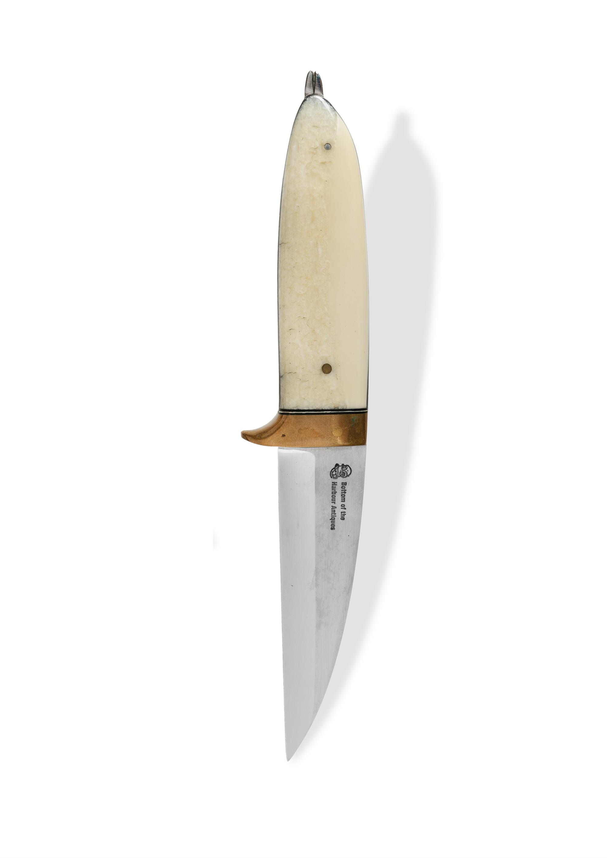 Randall Made Custom Knife Small drop point knife, with brass guard, and walrus ivory scale grips. The blade marked 'Bottom of the Harbour Antiques', in Randall made leather sheath. NB: ivory export restrictions. (L16.5cm)