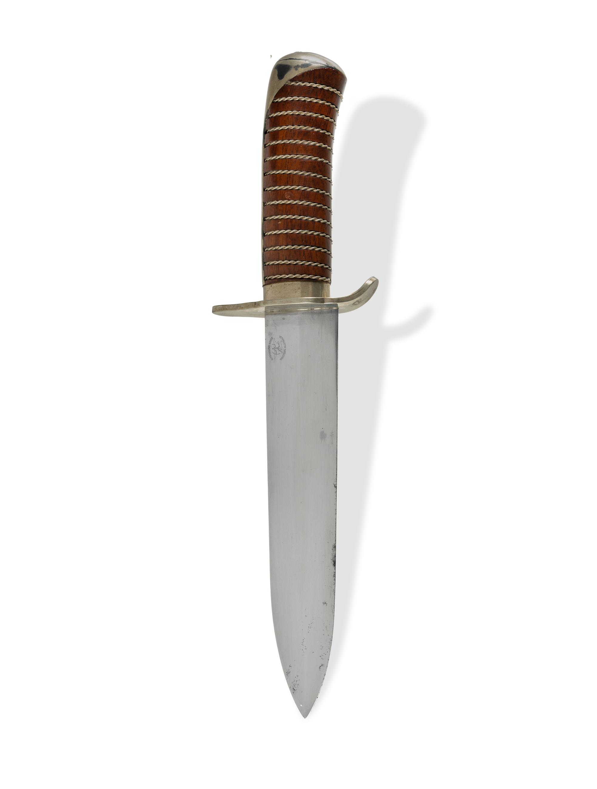 Handmade Custom 'Bushmans Edge' Bowie Knife Jim Steele. Spear point blade. Wire wrapped wooden hilt with nickel silver guard and fittings. (L30cm) PROVENANCE: From the collection of the late Warren MallardEstimate $100-200