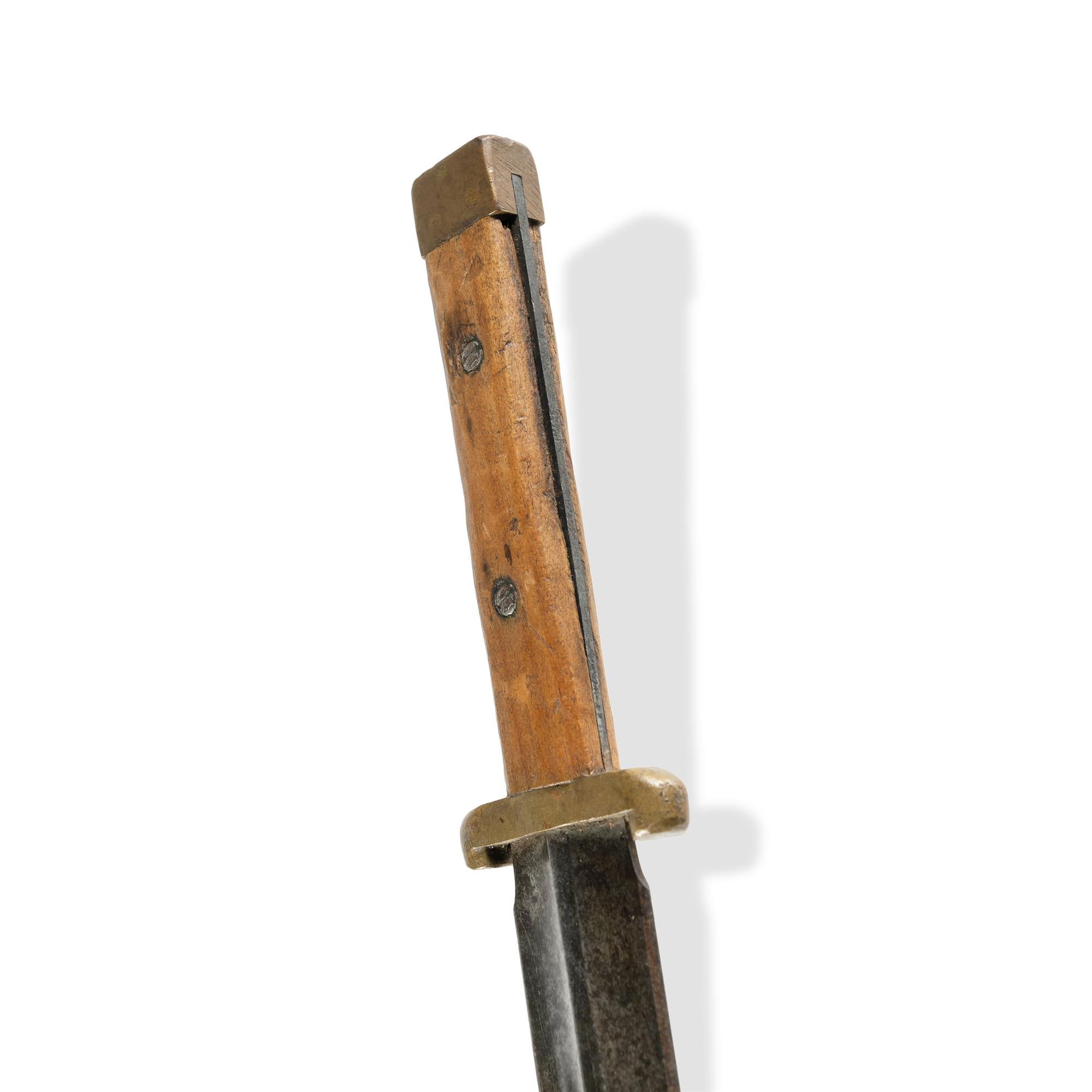 WWI Improvised Trench Knife Made from the tip of a sword, with simple wooden grip scales and brass guard and pommel. (L24.5cm) PROVENANCE: From the collection of the late Warren MallardEstimate $100-200