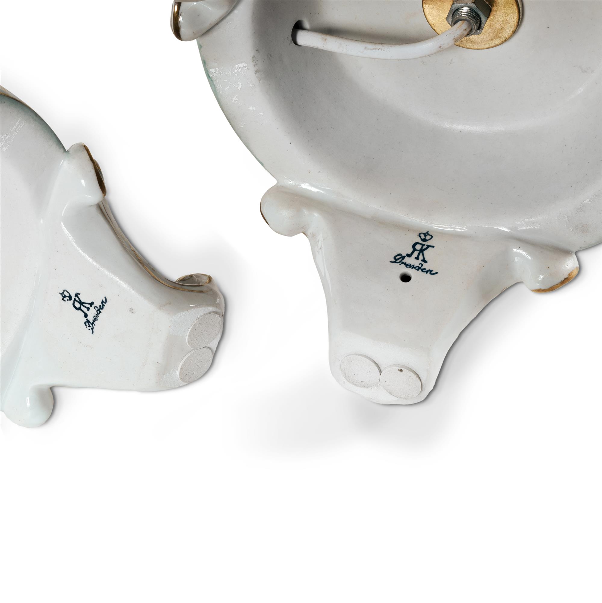 Pr 20th C Porcelain Figural Lamp Bases with Lithophane Shades The base with two frolicking children. Marked 'Dresden' to base. (H60cm)Estimate $300-500