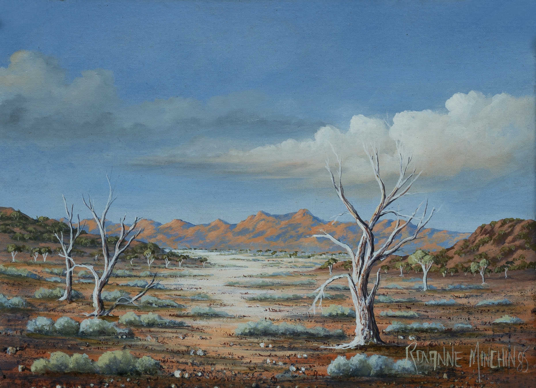 MINCHIN, Roxanne (b.1956) (2) 'Towards the Manna Hills, SA' and 'Near Yanco Glen [NSW]', both 1985. Acrylic on Board (2) 23x30.5cm (each)Estimate $400-600