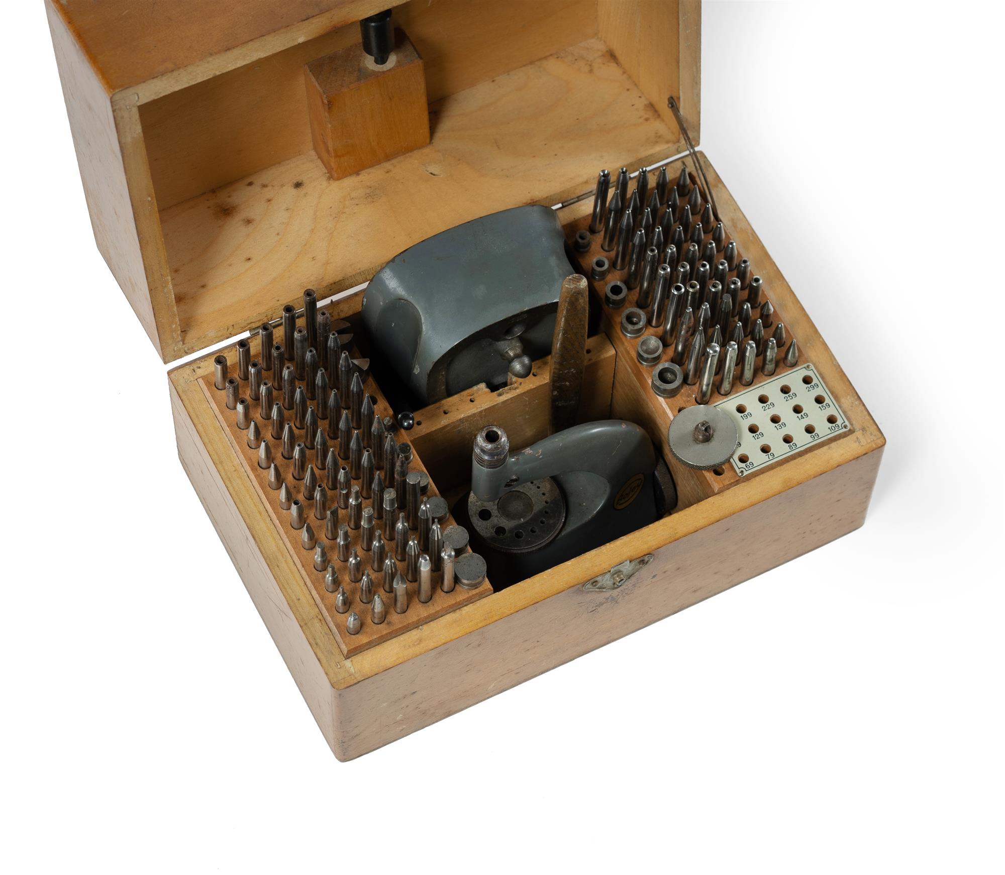 Watchmaker Topping Tool and Staking Tool Brass and steel older topping tool on cedar base with drawer containing accessories and 7 teeth cutters. Requires restoration. Also, a cased staking set.Estimate $400-600