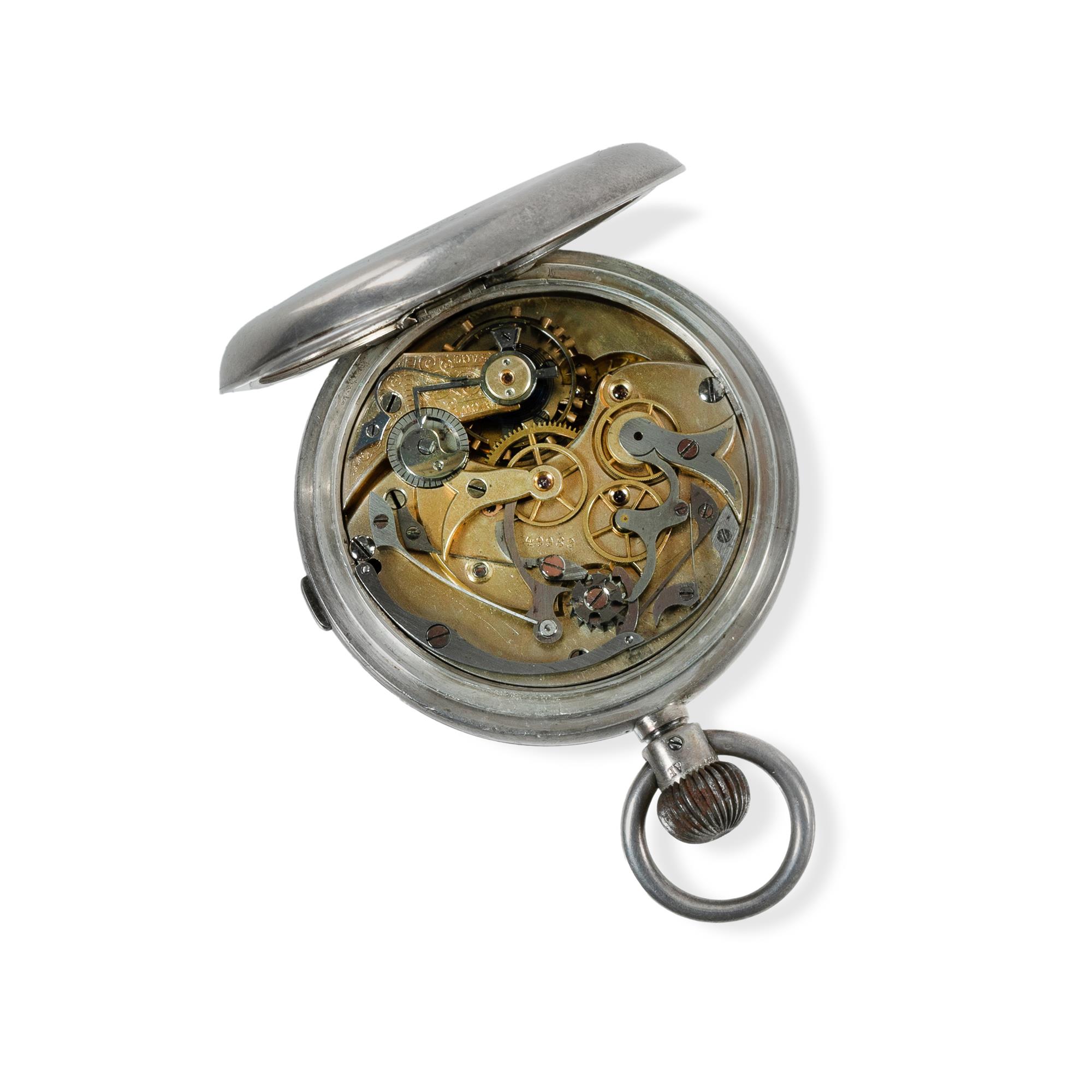Sir John Bennett Half Hunter Chronograph Silver and enamel cased side button chronograph in original box with correct receipt, dated June 1885. Clean stem wind lever set movement with poised balance. Mainspring broken.Estimate $300-600