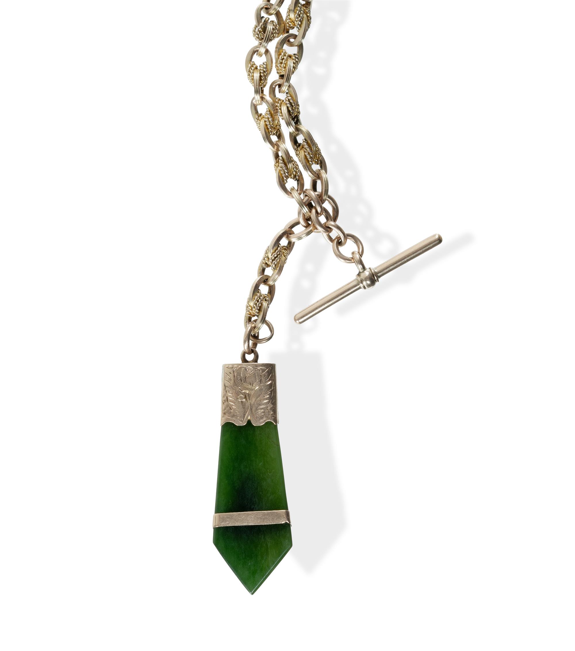 9ct Pink Gold Fancy Albert Chain and Fob Drop Fancy link Albert chain with T-bar and nephrite jade with NZ motif. L39cm with 3cm drop. W54.85g (total)Estimate $1,200-2,000