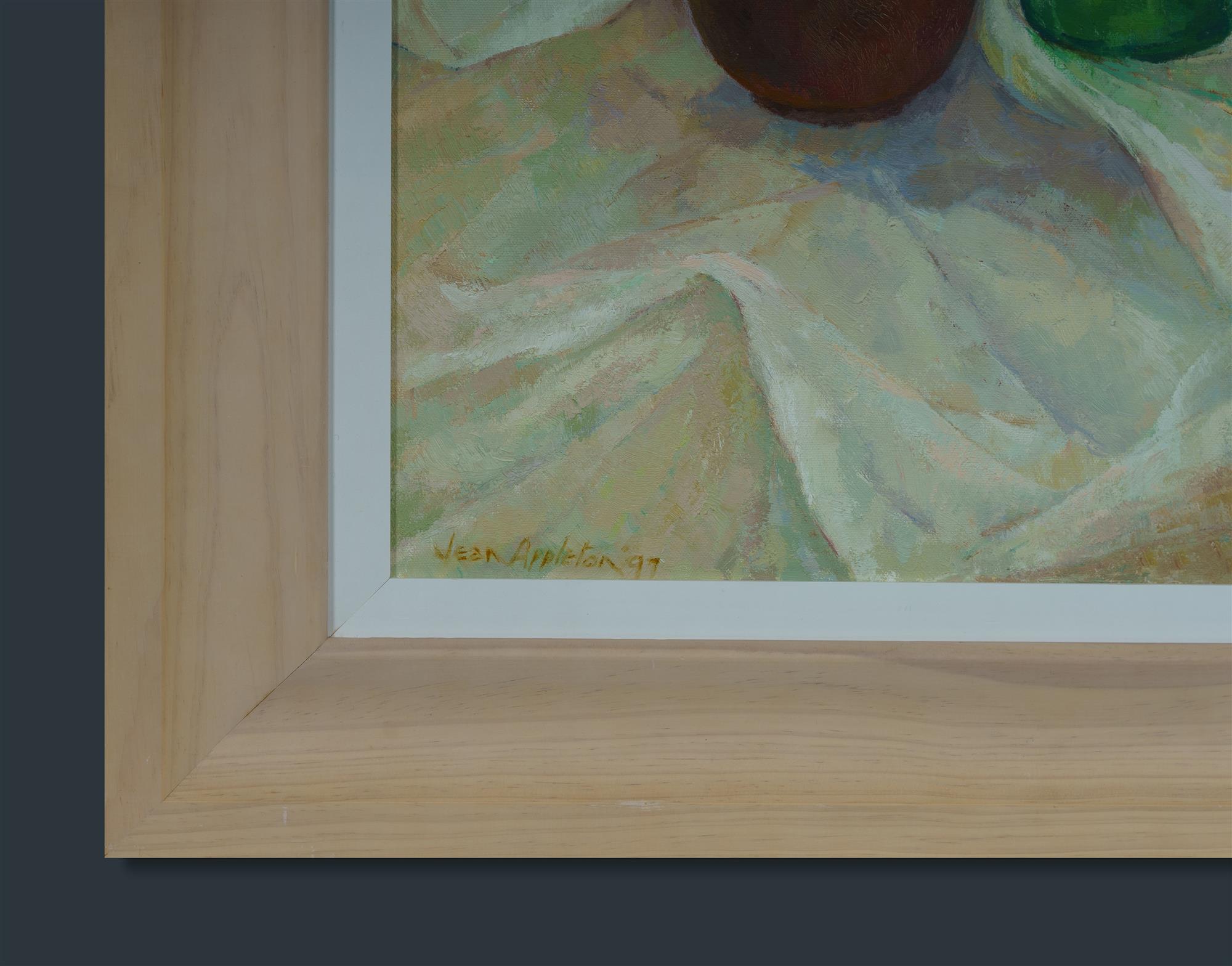 APPLETON, Jean (1911-2003) 'Bottles,' 1997. Signed lower left; titled and inscribed verso. Oil on Canvas 75.5x90cm PROVENANCE: The artist's daughter, Elisabeth Green. EXHIBITIONS: Jean Appleton, Artarmon Galleries, Sydney, 6th - 23rd May 2000, cat #1 (illustrated on invitation)Estimate $2,500-4,500