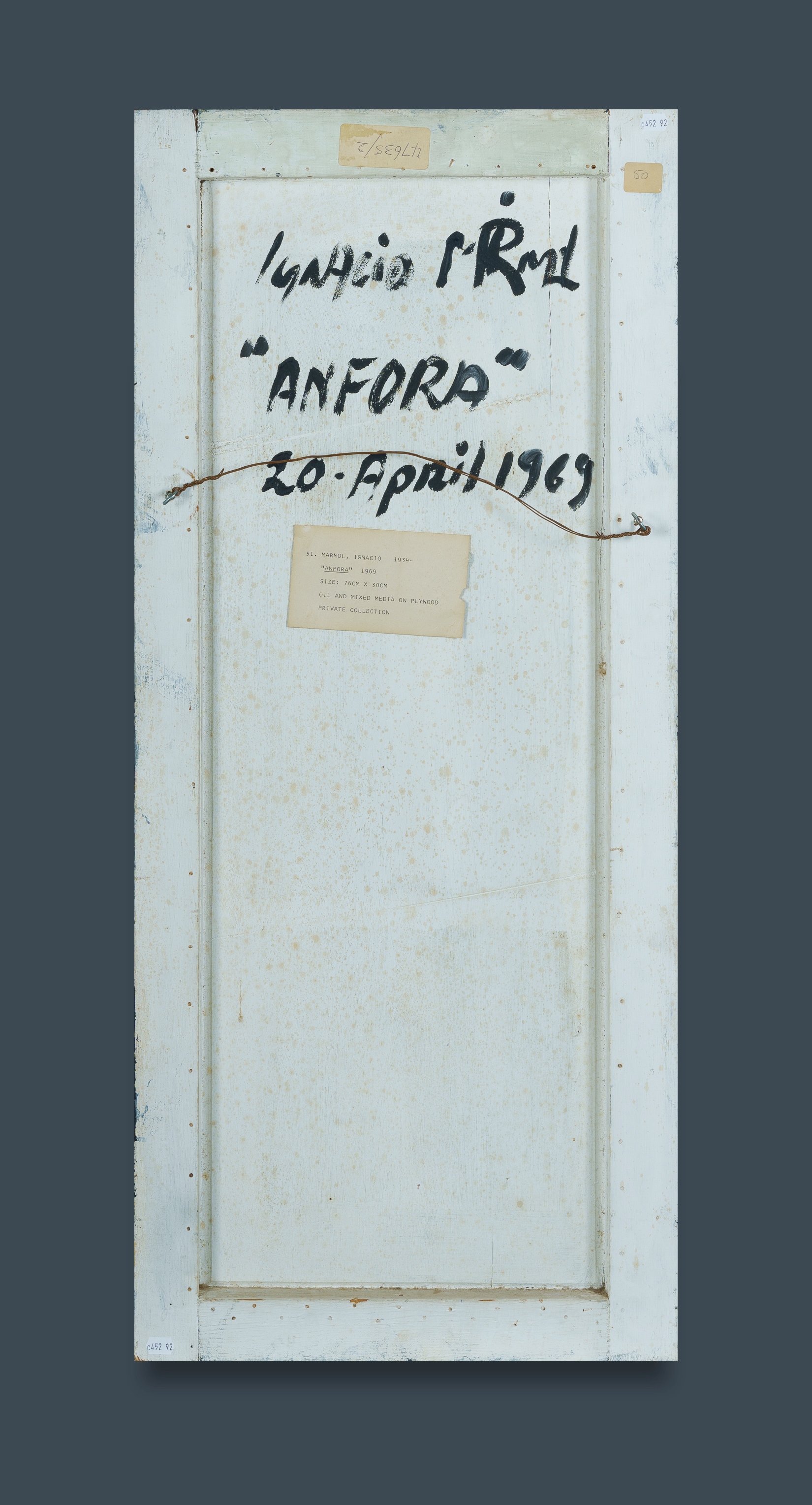 MARMOL, Ignacio Jose (1934-1994) 'Anfora,' 1969. Signed lower right. Oil & Mixed Media on Plywood 76.5x30cm PROVENANCE: The Fred and Elinor Wrobel Collection, Sydney; Estate Late Elinor Wrobel.Estimate $300-600