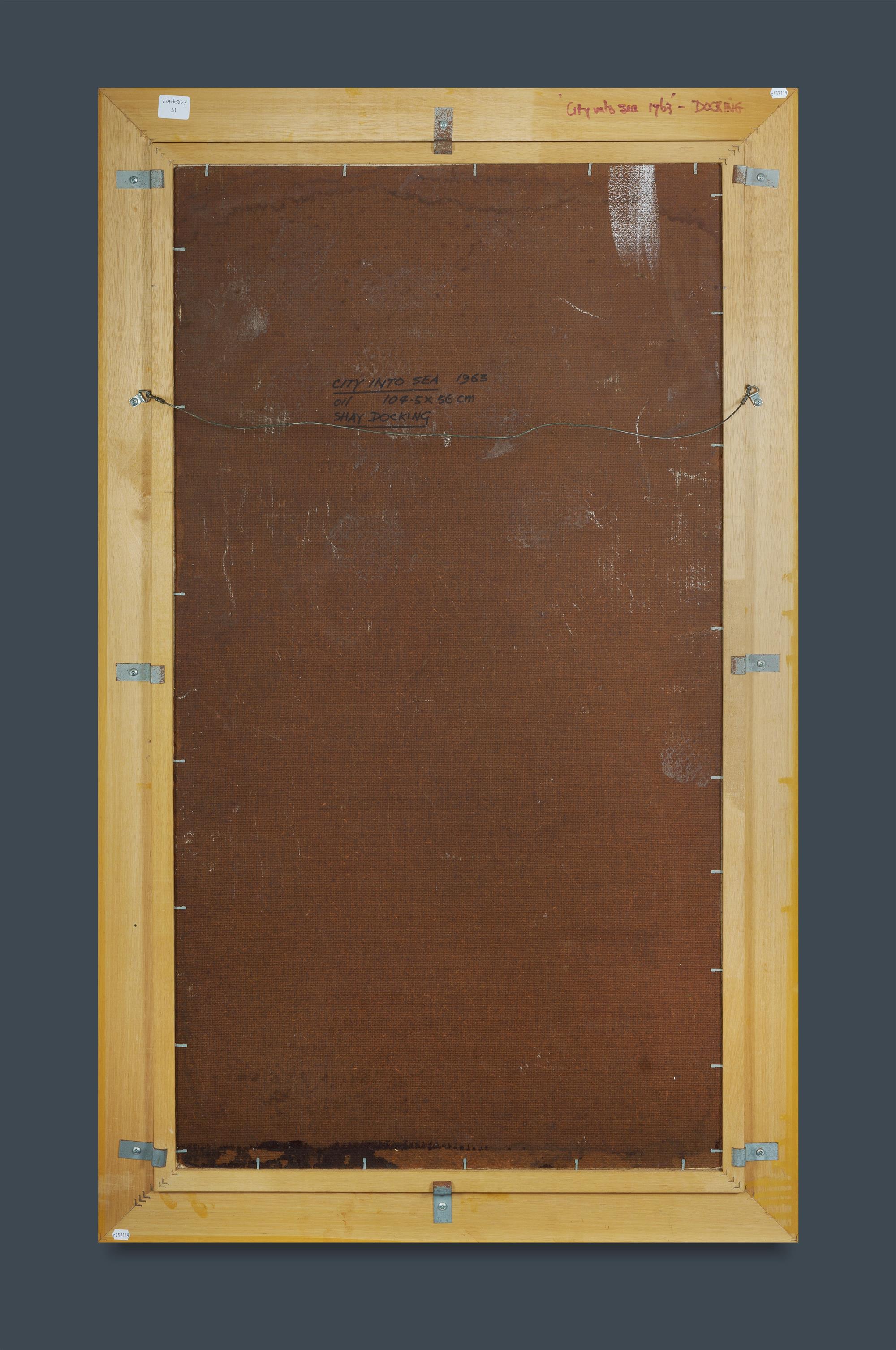 DOCKING, Shay (1928-1998) City into Sea, 1963. Signed lower right. Oil on Board 103.5x55cm PROVENANCE: The Fred and Elinor Wrobel Collection, Sydney; Estate Late Elinor Wrobel.Estimate $1,000-2,000