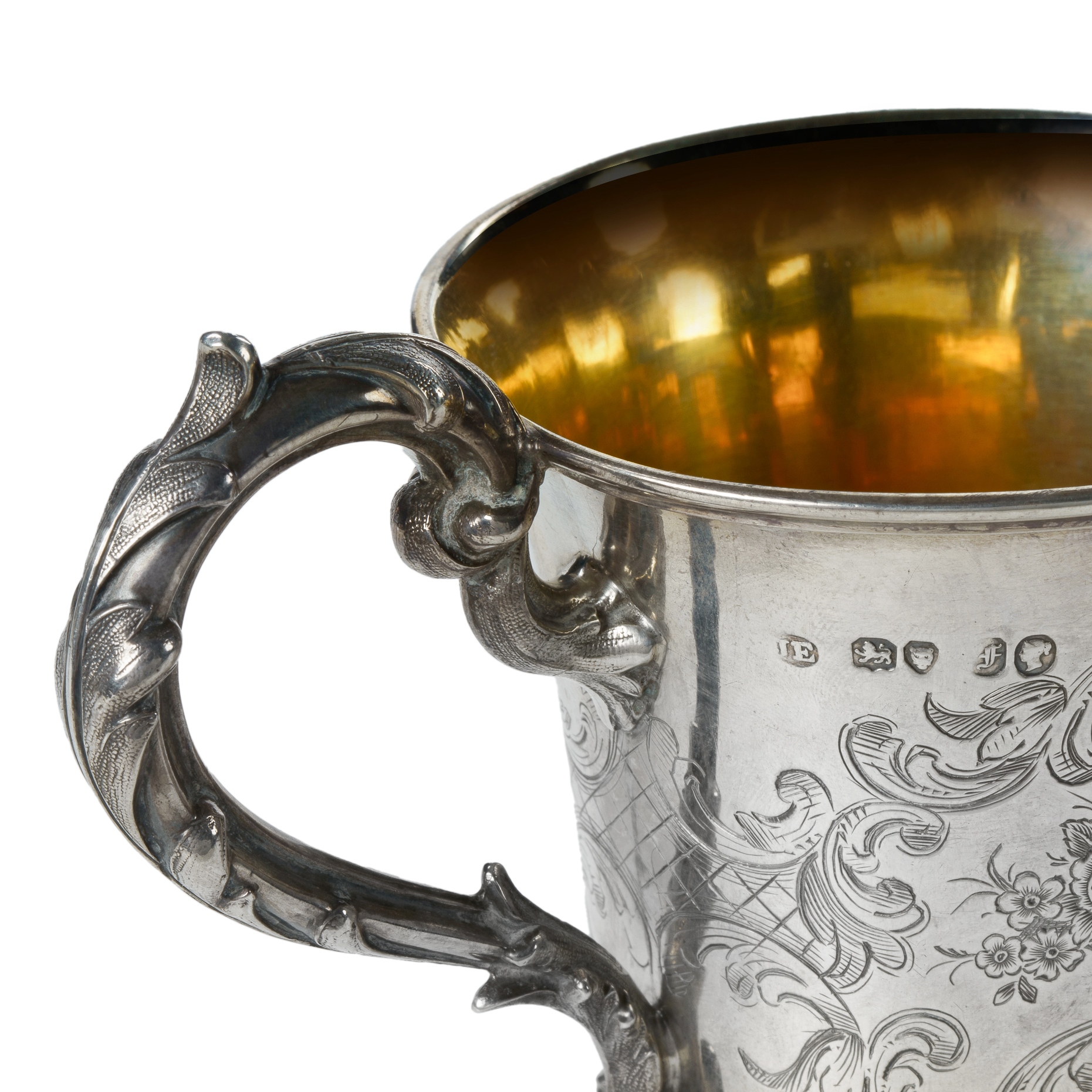 Victorian Sterling Silver Jug HM London 1841, maker John Evans II. With cast scroll feet and handle, engraved with floral baskets and presentation inscription. 'Presented to George Heywood by his godfather Capt. Emmett Nov 25th 1846' (H9cm W147g)Estimate $100-200