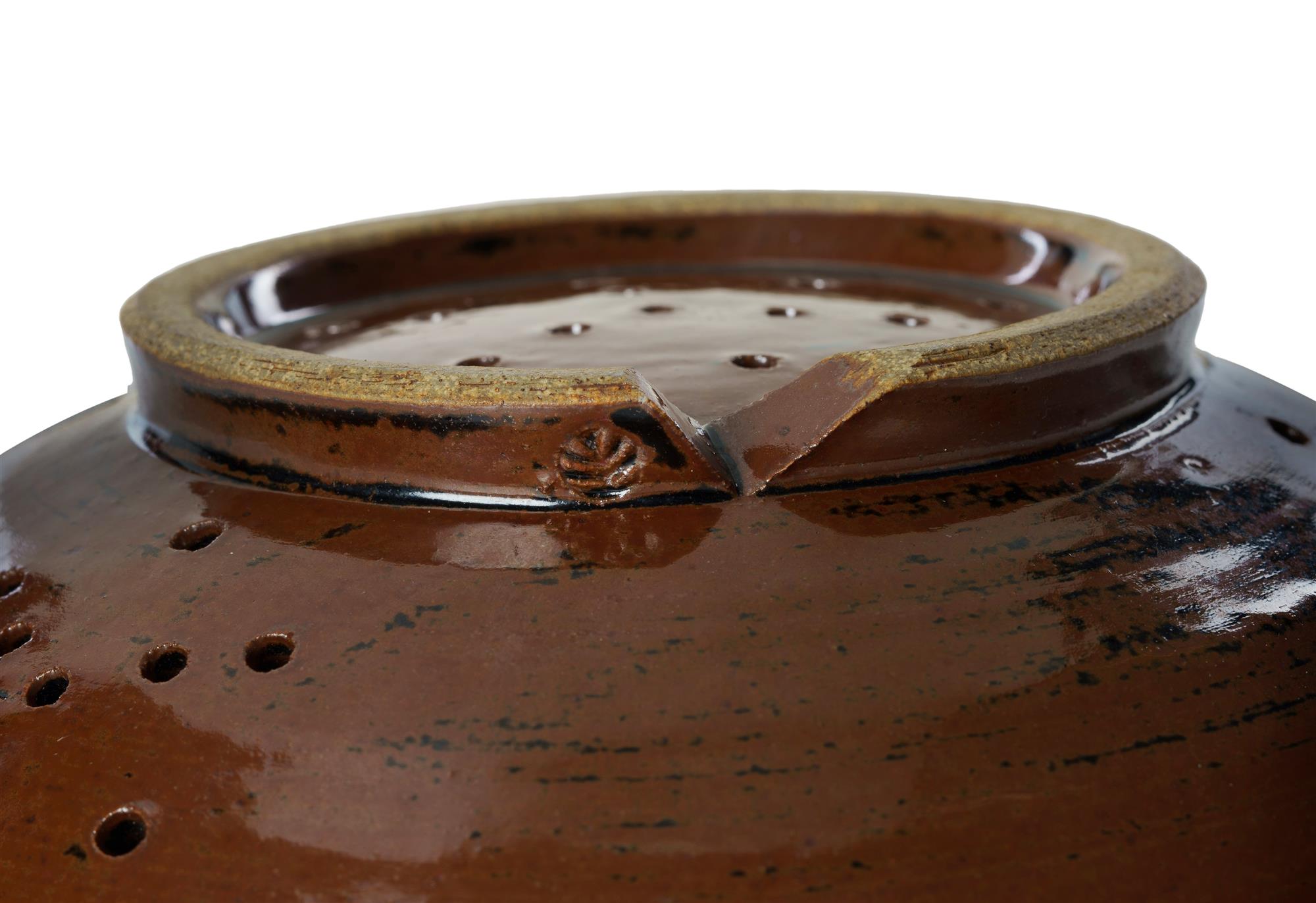 Stoneware Lidded Strainer Container Pierced bowl with quartered handle to lid. Tenmoku and rust glaze with brushed blue glaze to lid. Impressed seal to foot. (Dia.24cm)Estimate $60-80