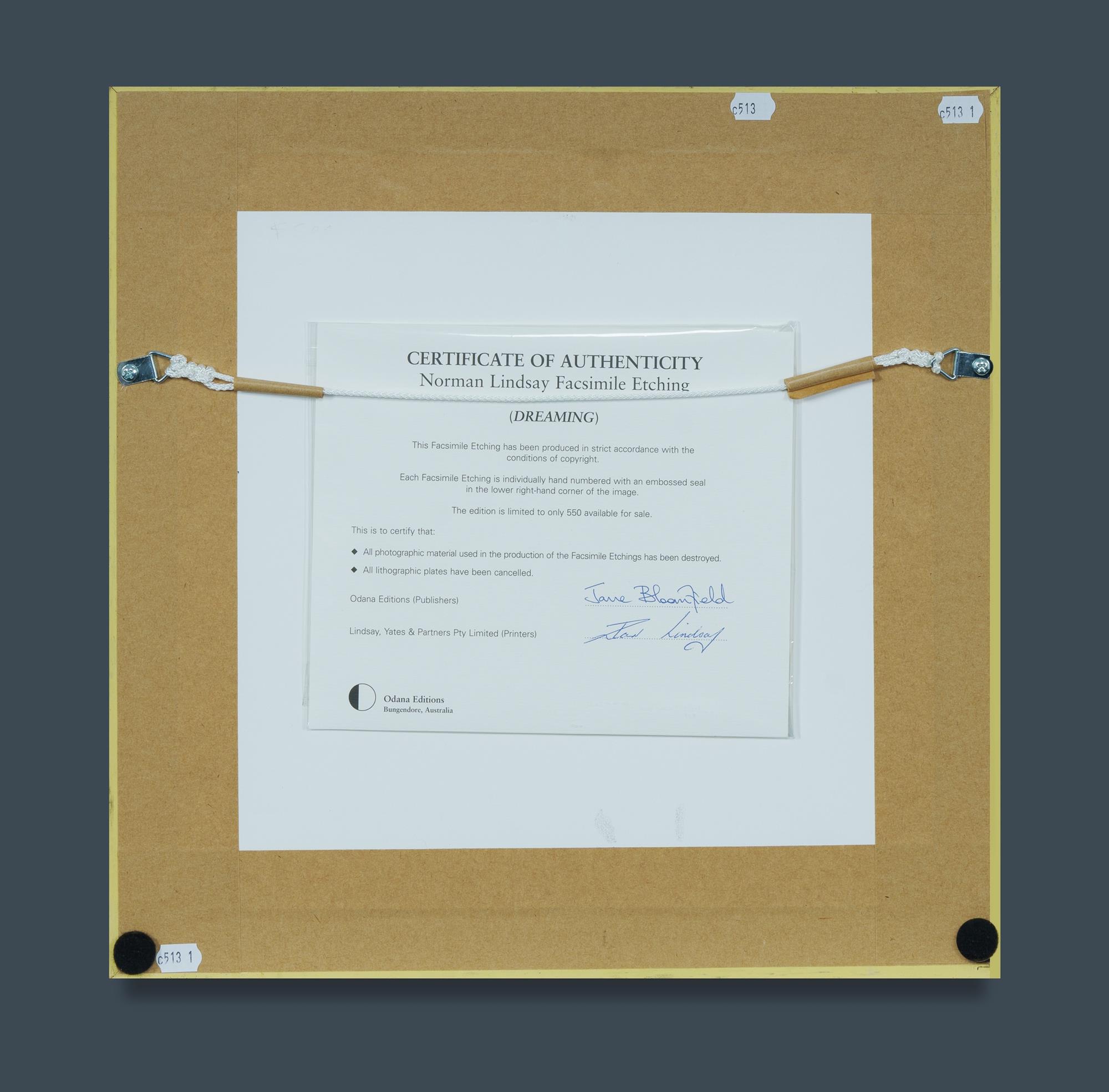 LINDSAY, Norman (1879-1969) Dreaming Certificate of authenticity from Odana Editions verso. Facsimile Etching 497/550 5x9.5cm (image)Estimate $100-200
