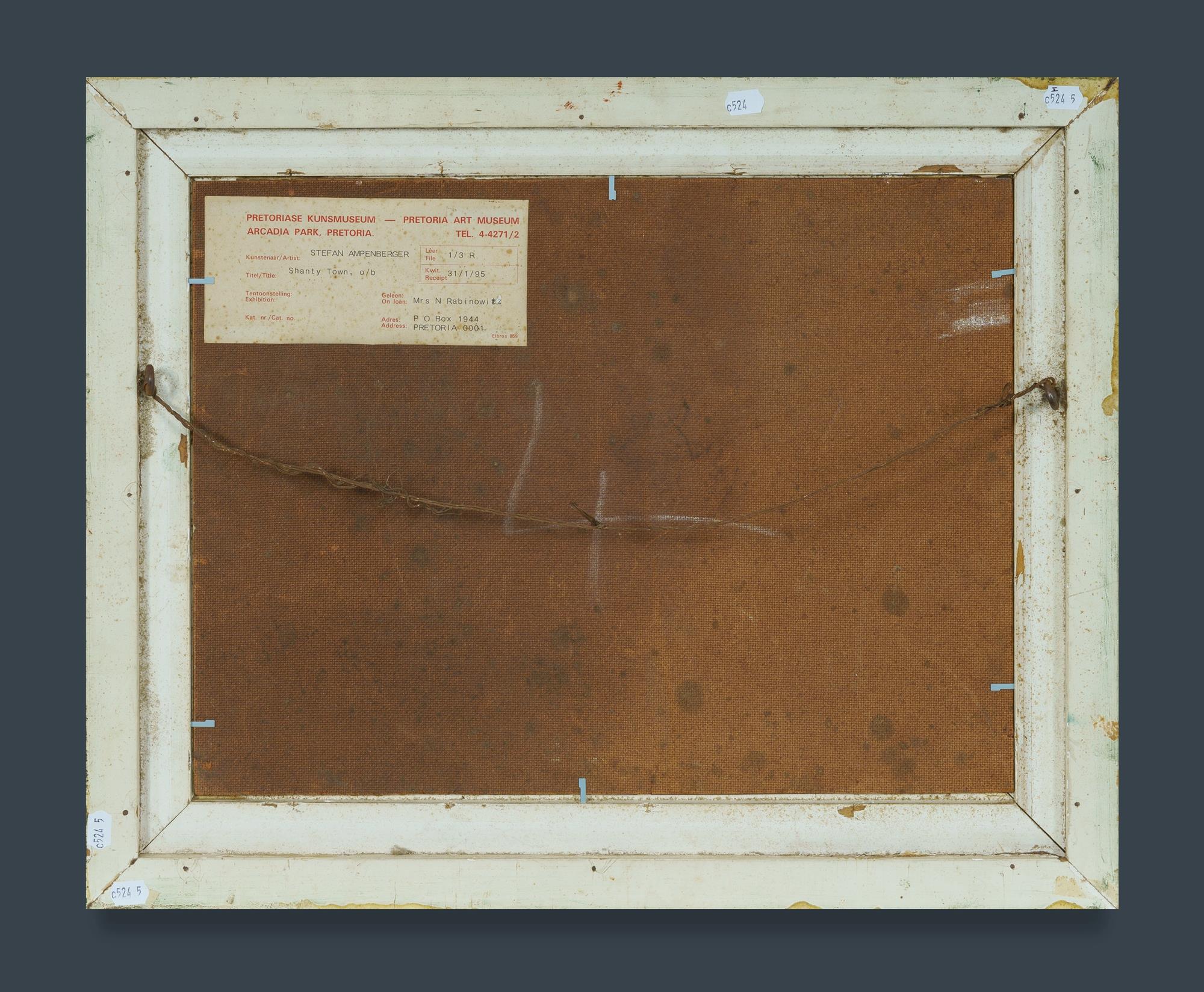 AMPENBERGER, Stefan (South African 1908-1983) 'Shanty Town' Label verso for Pretoria Art Museum, ref no.1/3R, dated 31/1/95 Oil on Board 28x37cmEstimate $100-200