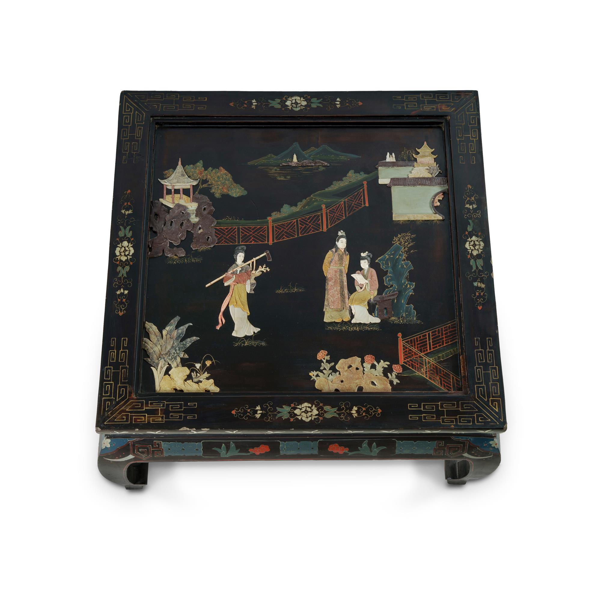 Chinese Ebonised Low Tea Table Decorated with hardstone inlay of figures in a garden. (H42cm, top 76x76cm)Estimate $300-500