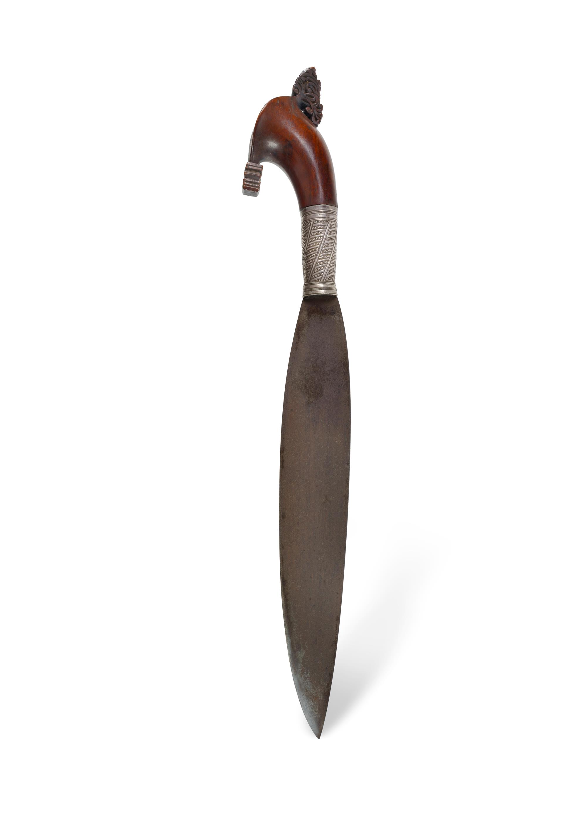 19th C Silver Mounted Moro Barong Knife Typical single edged leaf form blade. L36cm (blade) L52cm (total) PROVENANCE: From the collection of the late Warren MallardEstimate $400-800