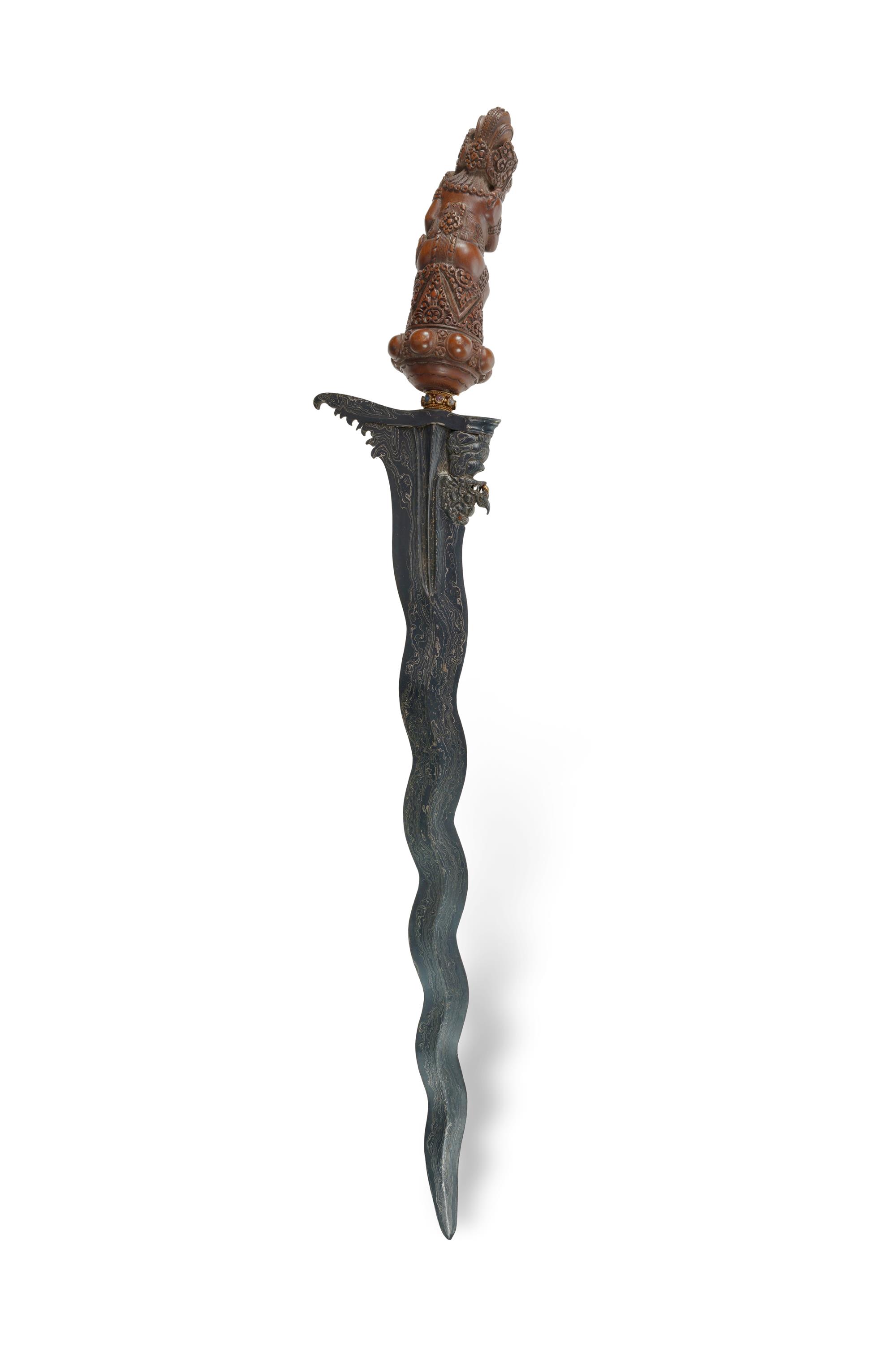 Fine Quality Indonesian Keris Pamor blade with 11 luk (curves); the base of the blade with a carved seated figure. (L57cm) PROVENANCE: From the collection of the late Warren MallardEstimate $600-900