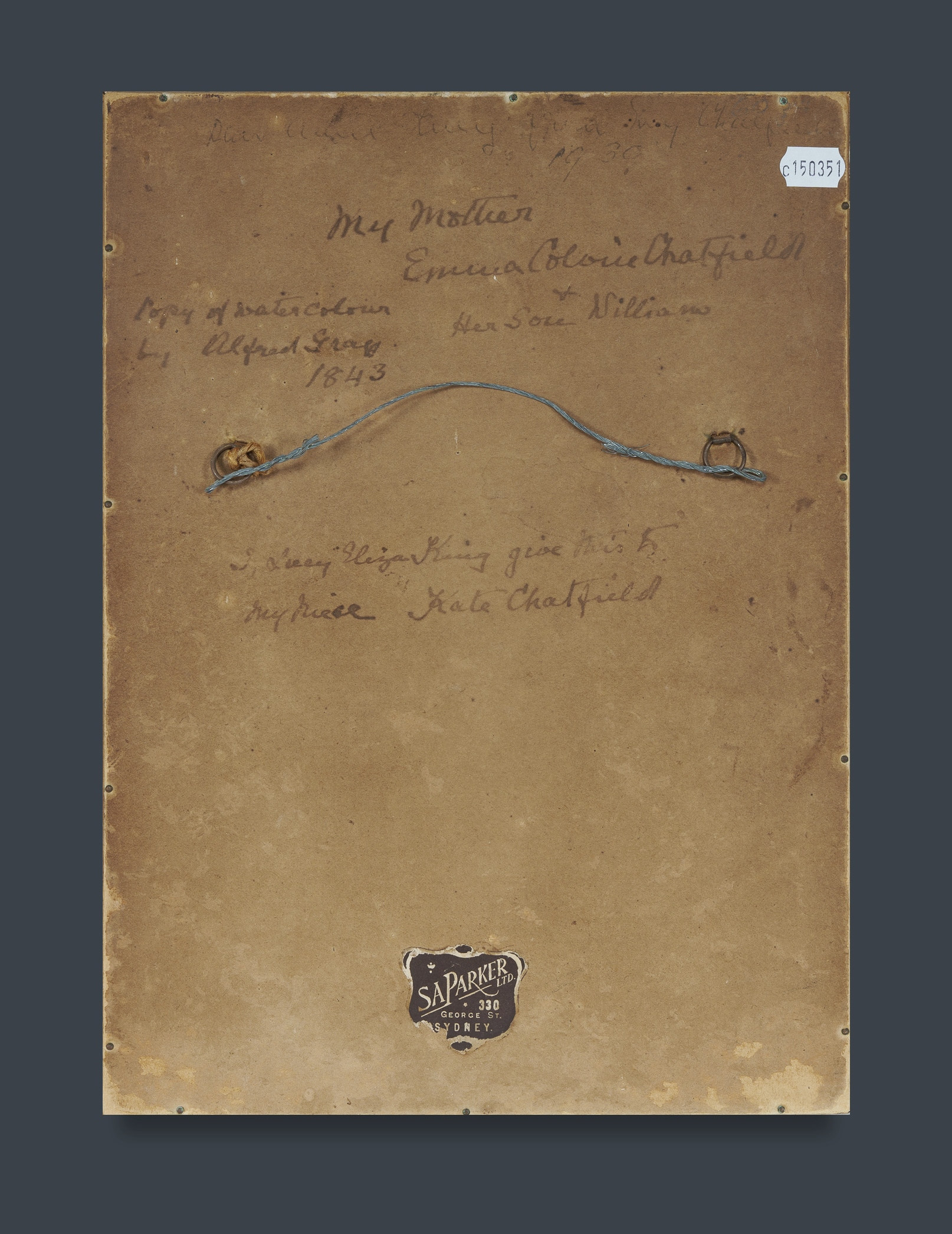 Artist Unknown, 19th Century Mother and Child No signature apparent. Inscribed verso: My Mother/Emelia Coline(?) Chatfield /+ Her Son William / Copy of Watercolour by Alfred Gray 1843 / I Lucy 'Eliza' King give this to my niece Kate Chatfield. And in a later hand: Dear Aunt Tilly [...] Chatfield / 1930. Label for SA Parker Ltd, Sydney, verso. Gouache & Pencil 20x15.5cm