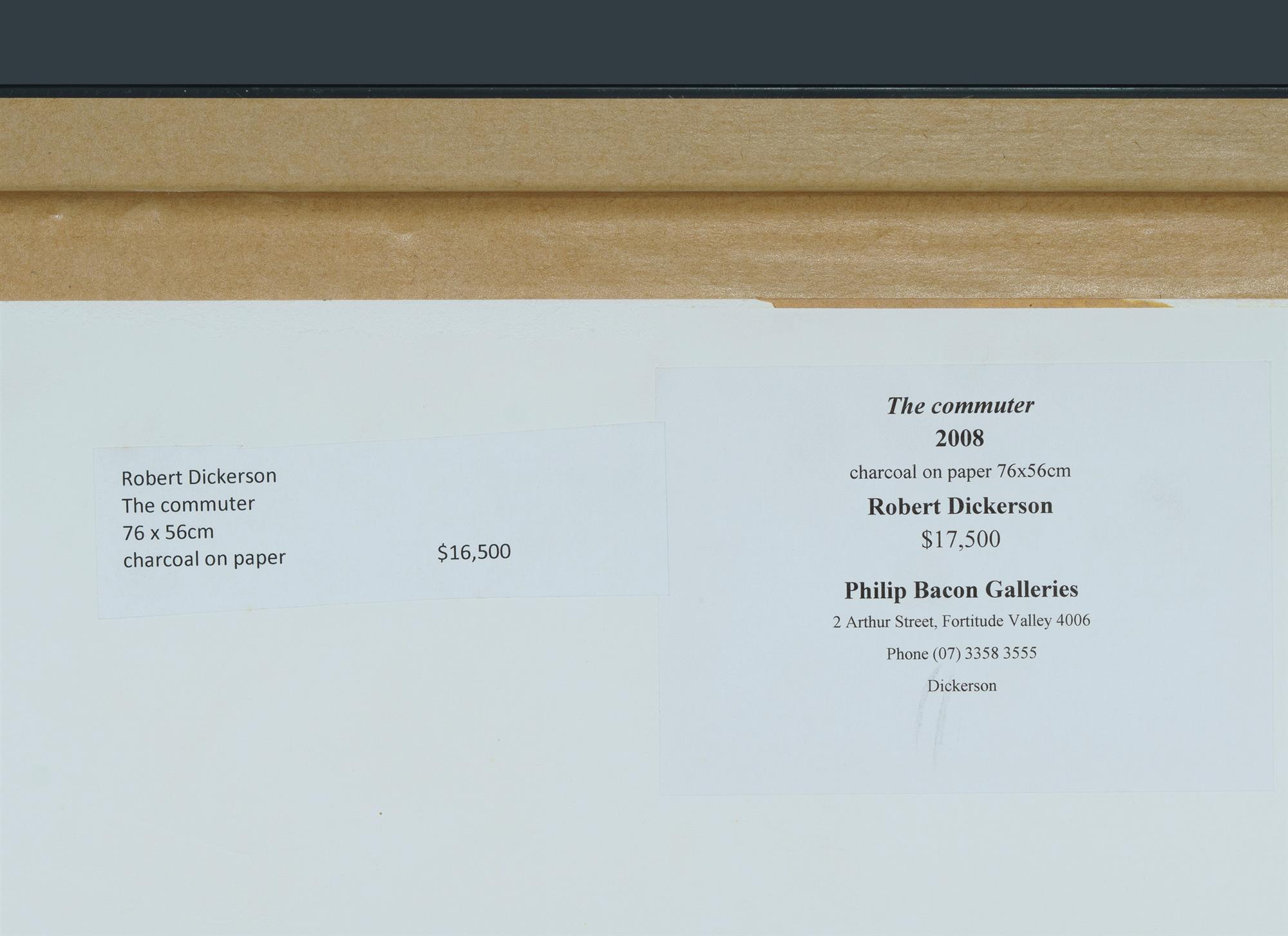 DICKERSON, Robert (1924-2015) 'The Commuter' Signed lower right. Ex Philip Bacon Galleries, Brisbane (label verso) Charcoal 75x55cmEstimate $3,000-4,500