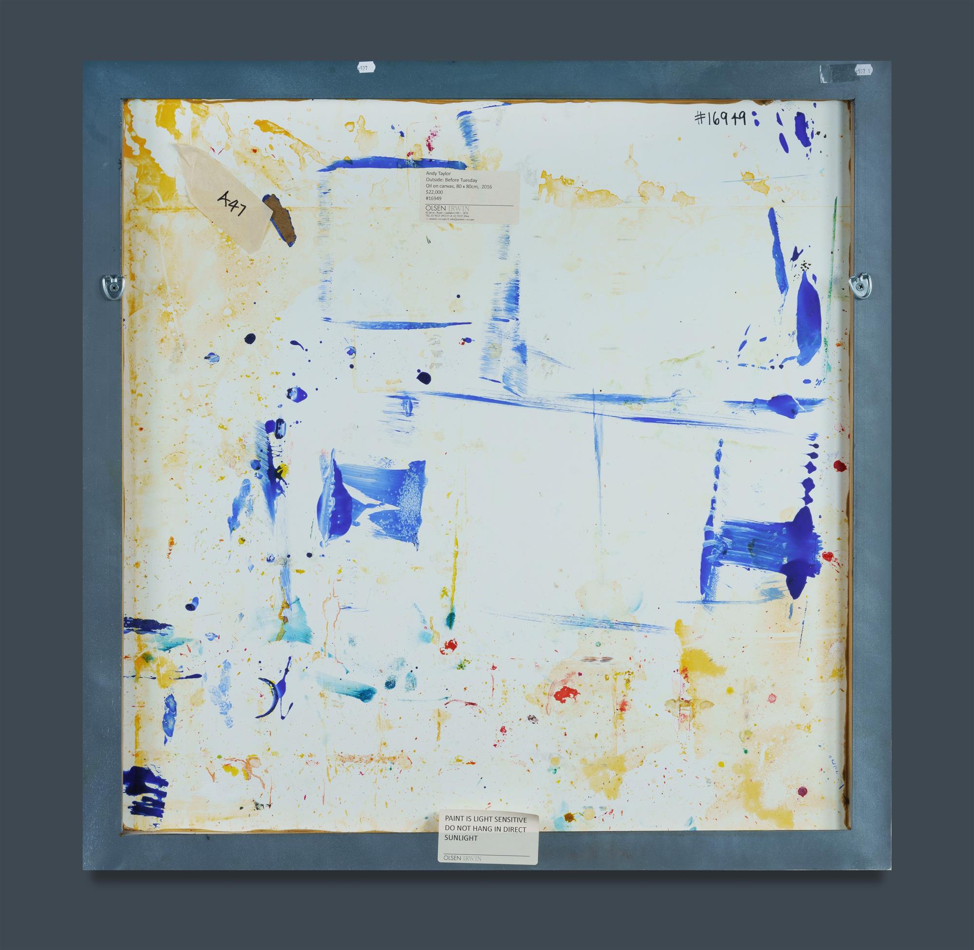TAYLOR, Andrew (b.1967) 'Outside: Before Tuesday,' 2016. Ex Olsen Irwin Gallery, Woollahra, Sydney (label verso) Oil on Board 80x80cm PROVENANCE: Private collection, Sydney.Estimate $1,500-3,000