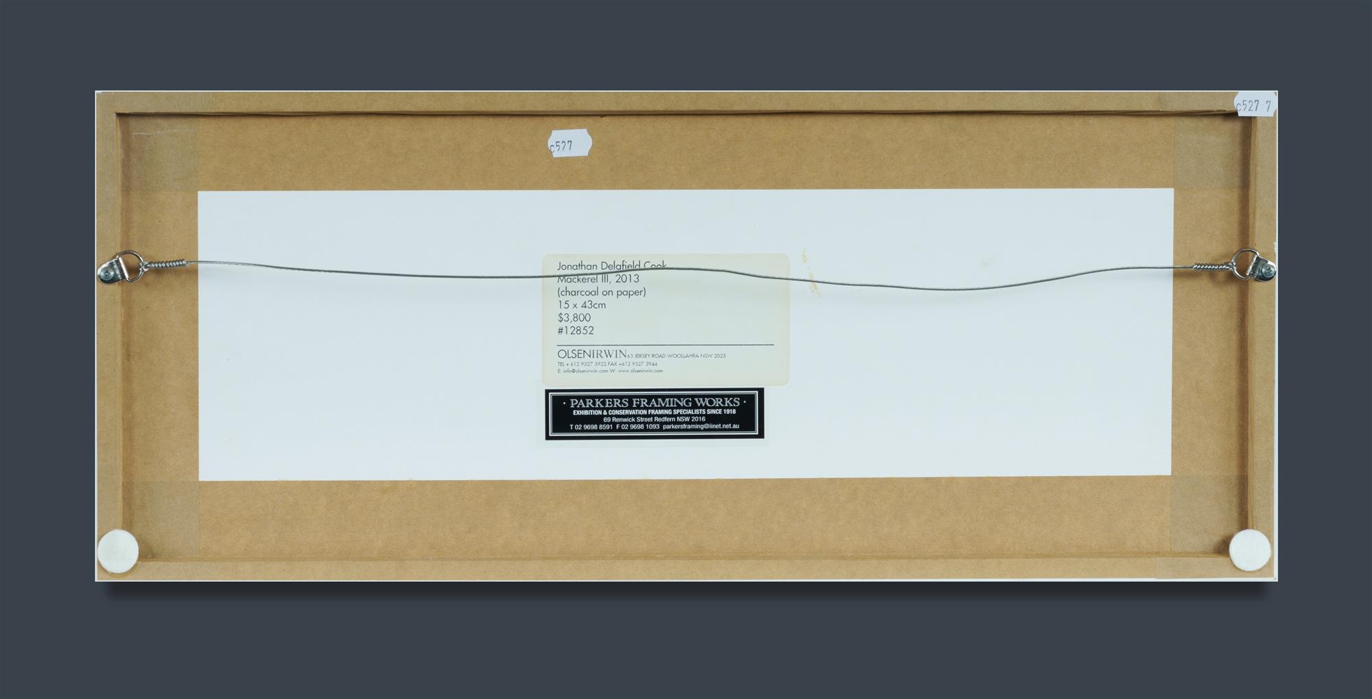COOK, Jonathan Delafield (b.1965) 'Mackerel III,' 2013. Ex Olsen Irwin Gallery, Woollahra Sydney (label verso) Charcoal on Paper 15x43cm PROVENANCE: Private collection, Sydney.Estimate $1,200-2,500