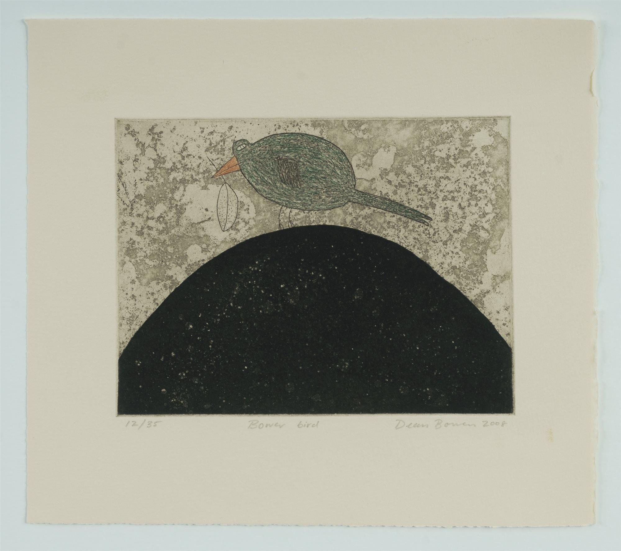 BOWEN, Dean (b.1957) 'Bower Bird,' 2008. Ex Tim Olsen Gallery, Sydney (label verso) Aquatint & Drypoint Etching 12/35 14.5x19.5cm (plate) PROVENANCE: Private collection, Sydney.Estimate $250-350