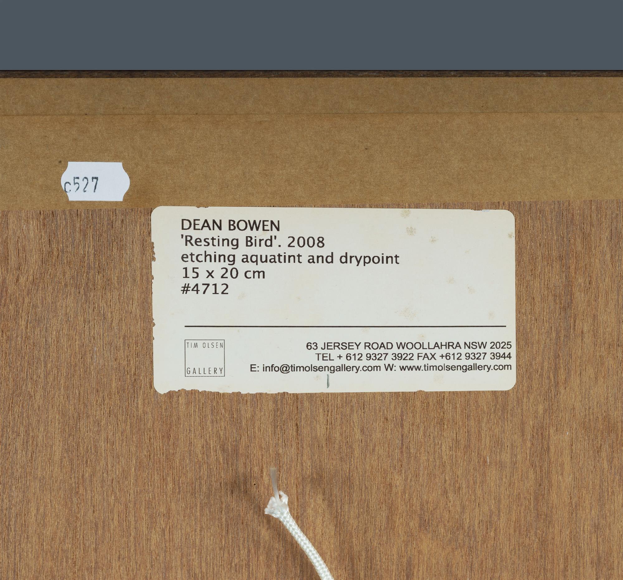 BOWEN, Dean (b.1957) 'Resting Bird,' 2008. Ex Tim Olsen Gallery, Sydney (label verso) Aquatint & Drypoint Etching 27/35 14.5x19.5cm (plate) PROVENANCE: Private collection, Sydney.Estimate $300-500