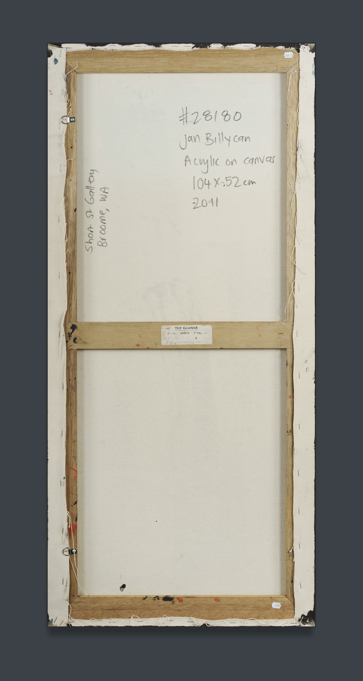 BILLYCAN, Jan (Aboriginal 1930-2016) 'Kirriwirri,' 2011. Acrylic on Canvas 114x53cm PROVENANCE: Short St Gallery, Broome, WA, cat #28180 (copy of certificate of authenticity available); private collection, Sydney.Estimate $2,500-3,500