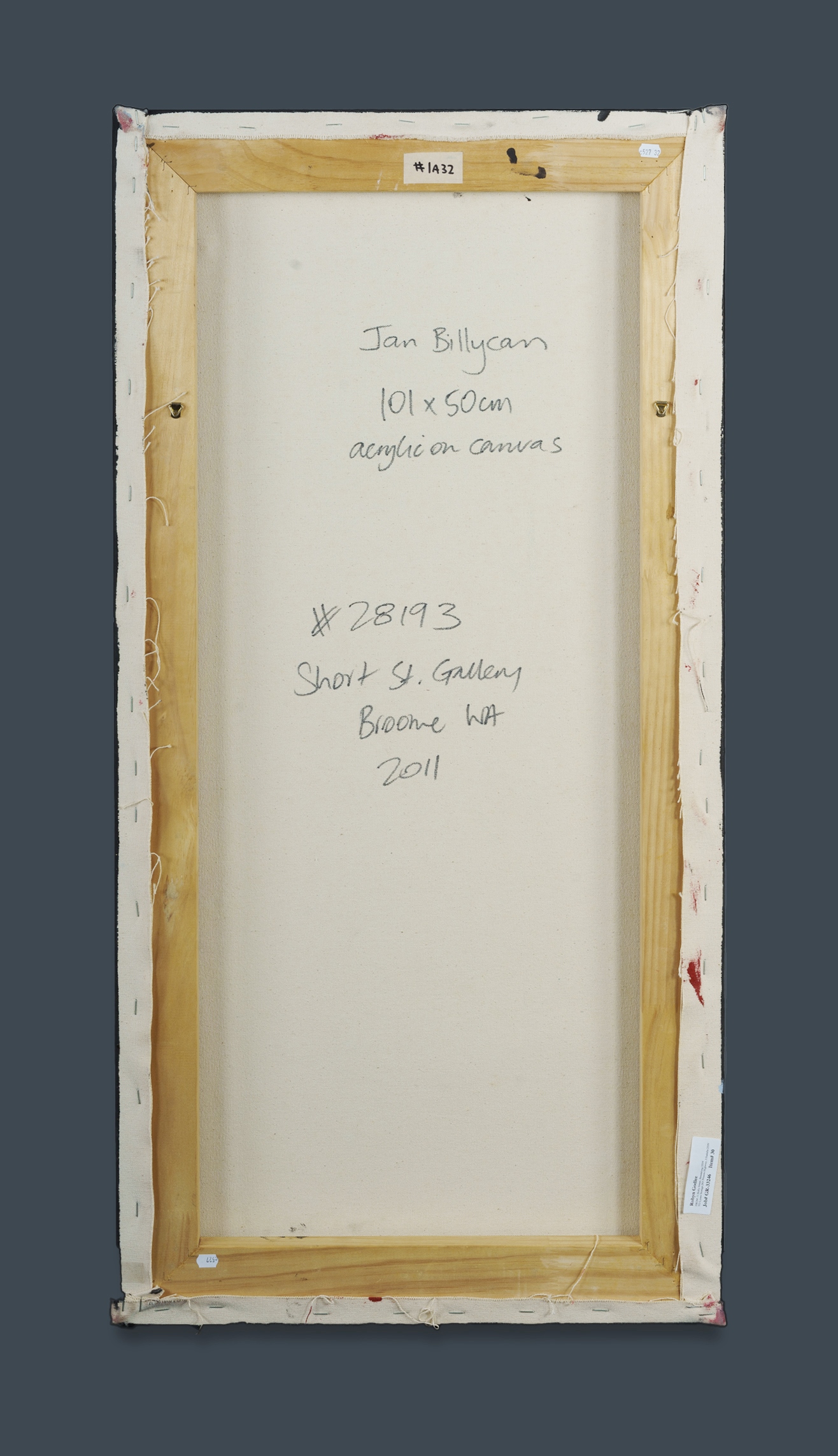 BILLYCAN, Jan (Aboriginal 1930-2016) Untitled, 2011. Acrylic on Canvas 101x50cm PROVENANCE: Short St Gallery, Broome, WA, cat #28193 (copy of certificate of authenticity available); private collection, Sydney.Estimate $2,500-3,500