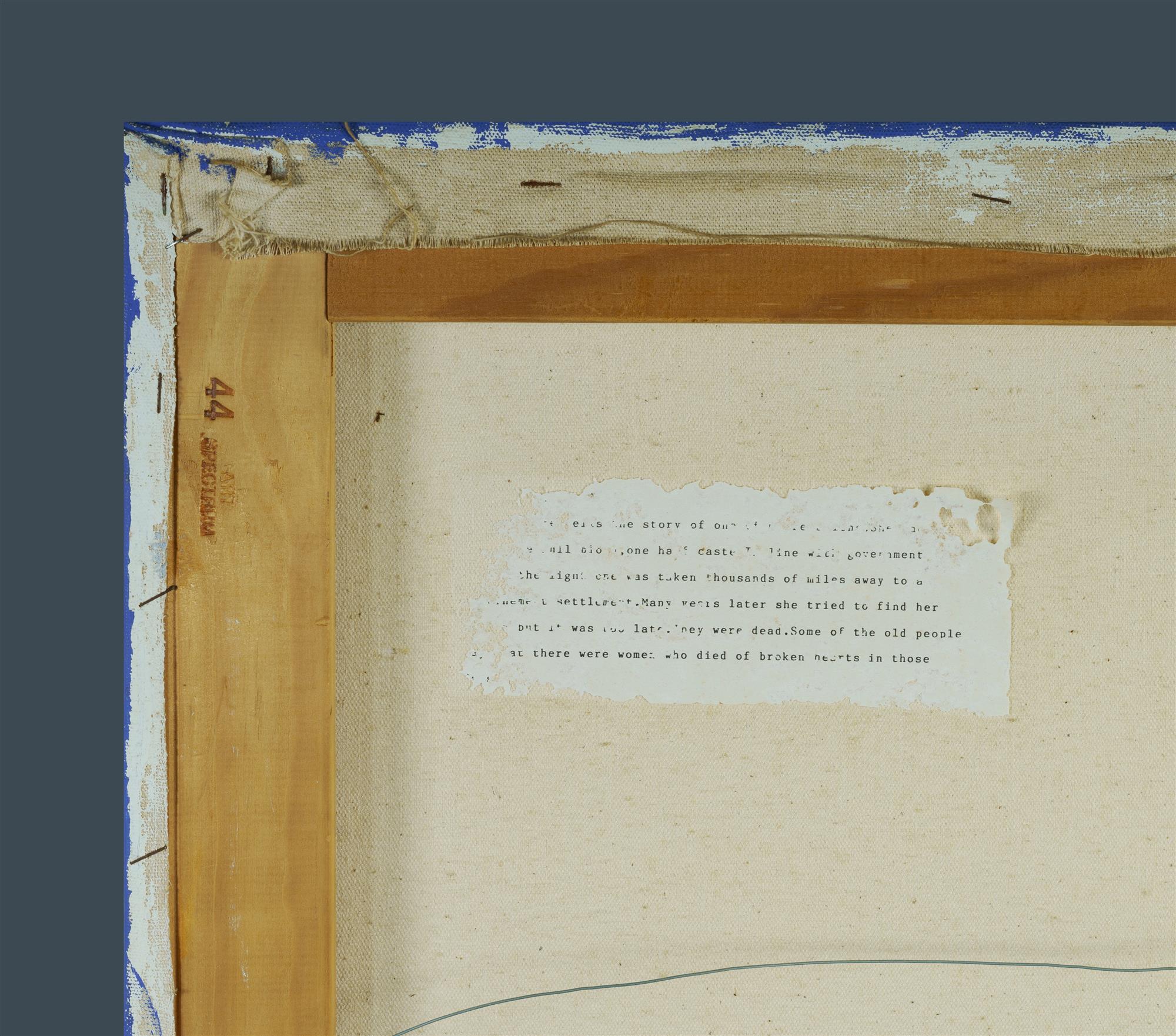 MORGAN, Sally (Aboriginal b.1951) Mixed Race Child Taken from Aboriginal Mother Label verso (perished) outlining story of the subject. Signed with artist's device lower right. Acrylic on Canvas 111.5x84cm PROVENANCE: Private collection, Sydney.Estimate $600-1,000