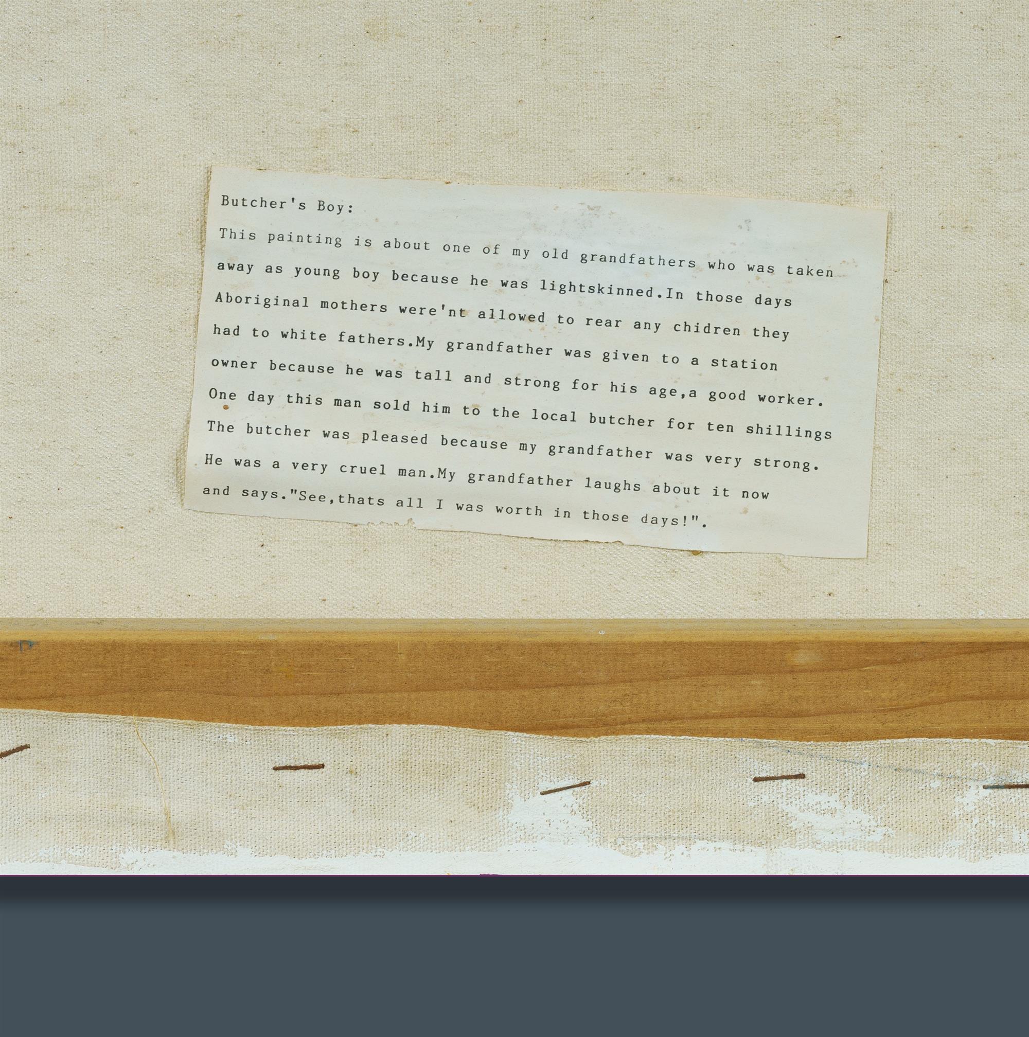 MORGAN, Sally (Aboriginal b.1951) 'Butcher's Boy' Label verso telling the story of the artist's grandfather taken away because he was light-skinned. Signed with artist's device lower right. Acrylic on Canvas 84x111.5cm PROVENANCE: Private collection, Sydney.Estimate $600-1,000