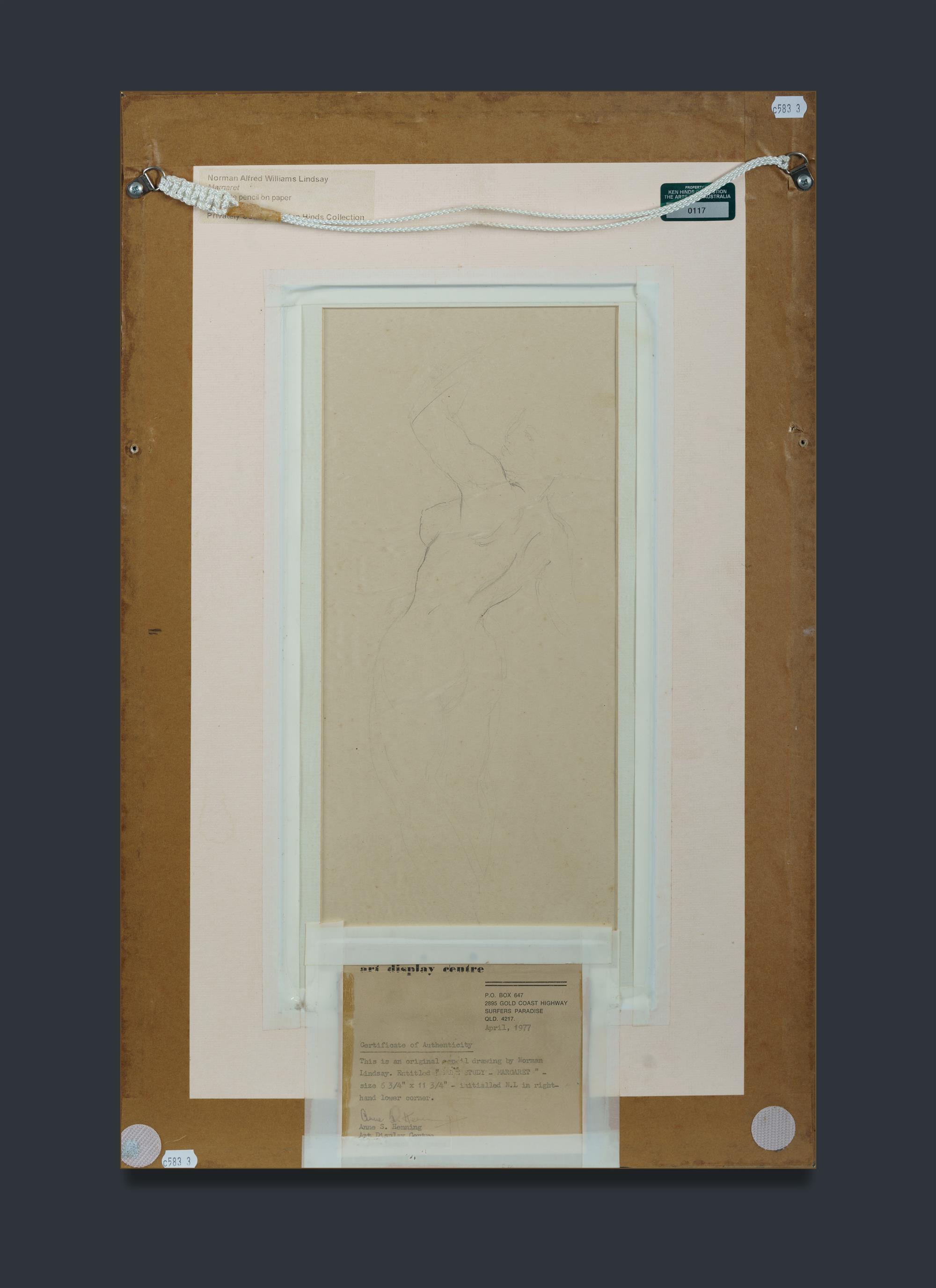 LINDSAY, Norman (1879-1969) 'Margaret' Initialled NL lower right. Additional pencil sketch verso. Certificate of authenticity verso, signed by Anne S. Henning, Art Display Centre, Qld, dated April 1977. Pencil 35x17.5cmEstimate $1,200-2,000
