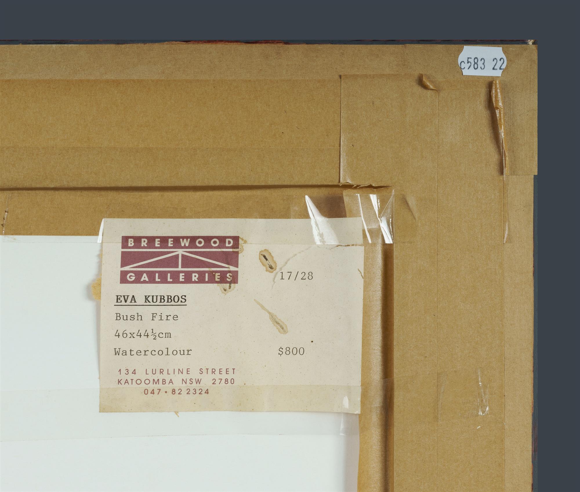 KUBBOS, Eva (b.1928) 'Bush Fire' Signed lower right. Breewood Galleries, Katoomba, label verso. W/Clr 44.5x43cmEstimate $180-300