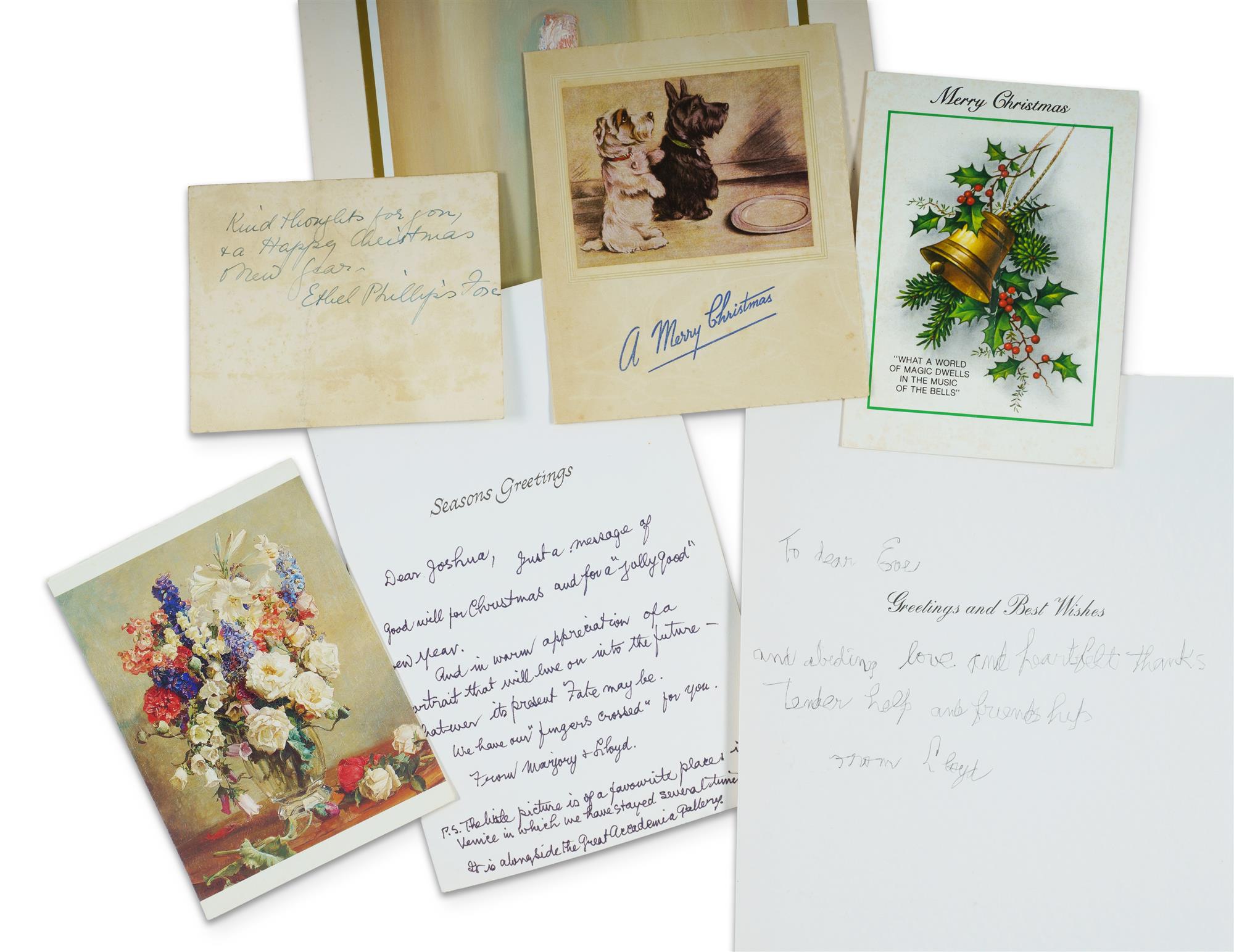 Box of Ephemera from Joshua Smiths Studio Including 7 Christmas cards from fellow artists including Ethel Phillips Fox [sic], Adelaide Perry, Ivor Hele, Lloyd Rees (all signed); 5 exhibition catalogues (3 of which are individually signed by Russell Drysdale, Lloyd Rees and Jean Bellette); and 5 other items.