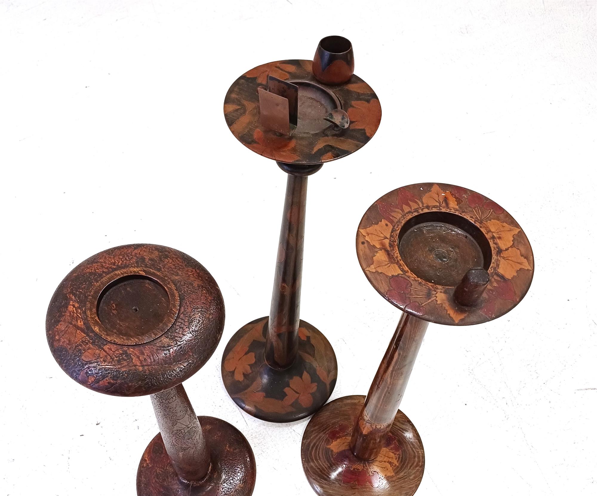 3 Australian Wooden Smokers Stands Each with pyrographed decoration. H76cm (tallest)Estimate $100-200
