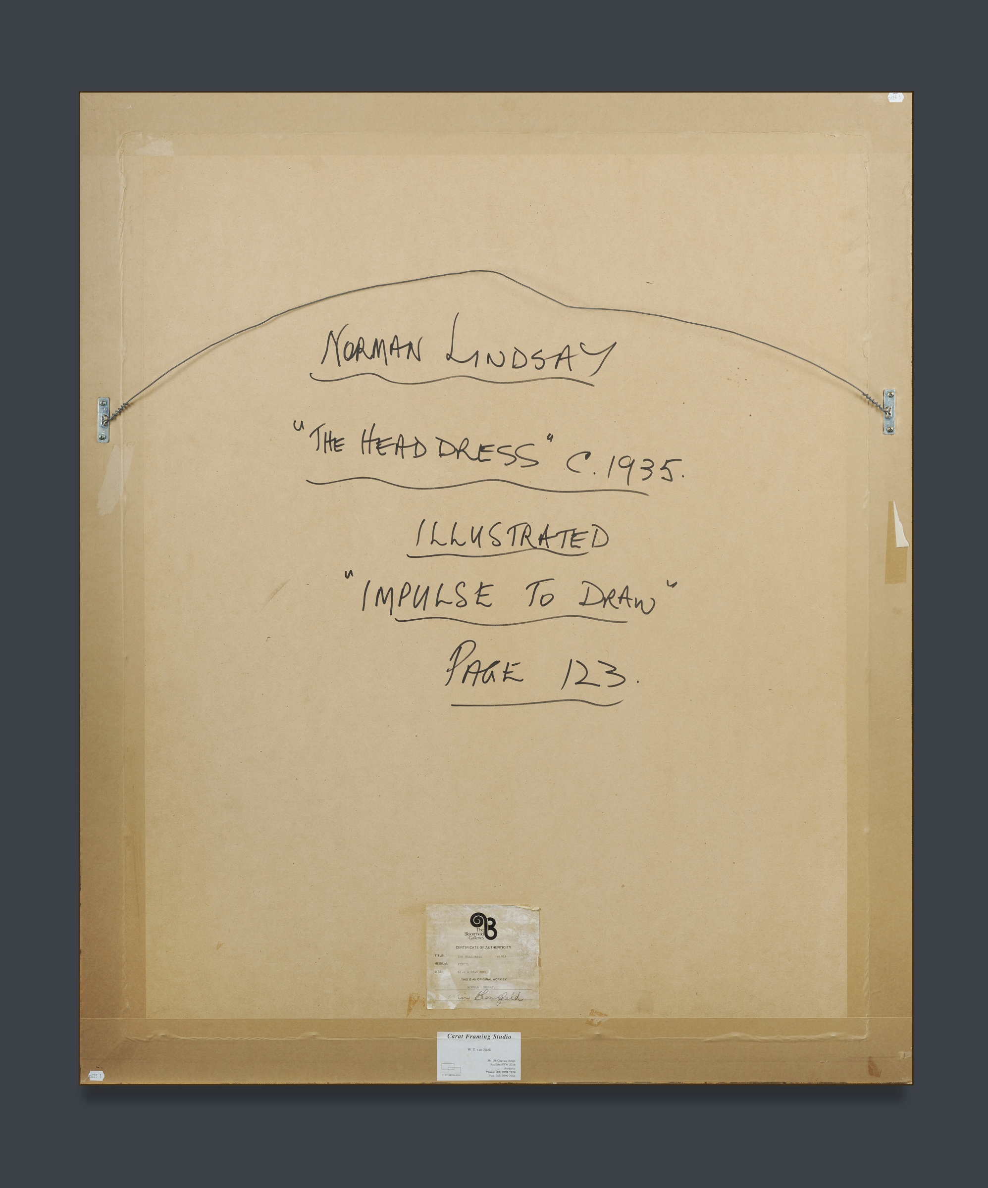 LINDSAY, Norman (1879-1969) 'The Head-Dress,' c.1935. Initialled 'NL' lower right. The Bloomfield Galleries certificate of authenticity verso, signed by Lin Bloomfield. Pencil 62.5x46cm