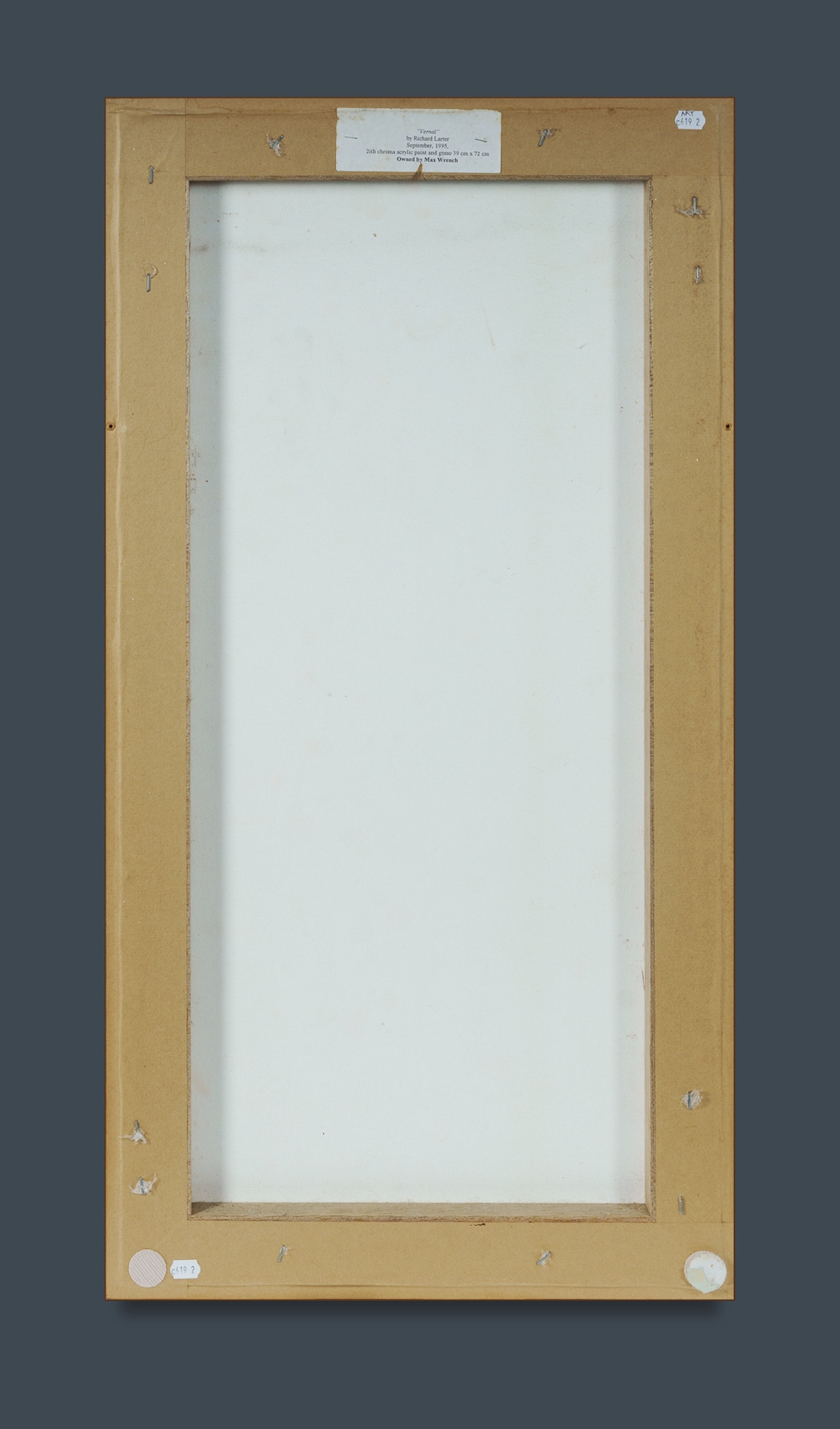 LARTER, Richard (1929-2014) 'Vernal,' 1995. Initialled lower right; old label verso. Acrylic, Gesso & Metallic Glitter Paint on Canvas 69x35cm PROVENANCE: Watters Gallery, Sydney; private collection, NSW.Estimate $800-1,500