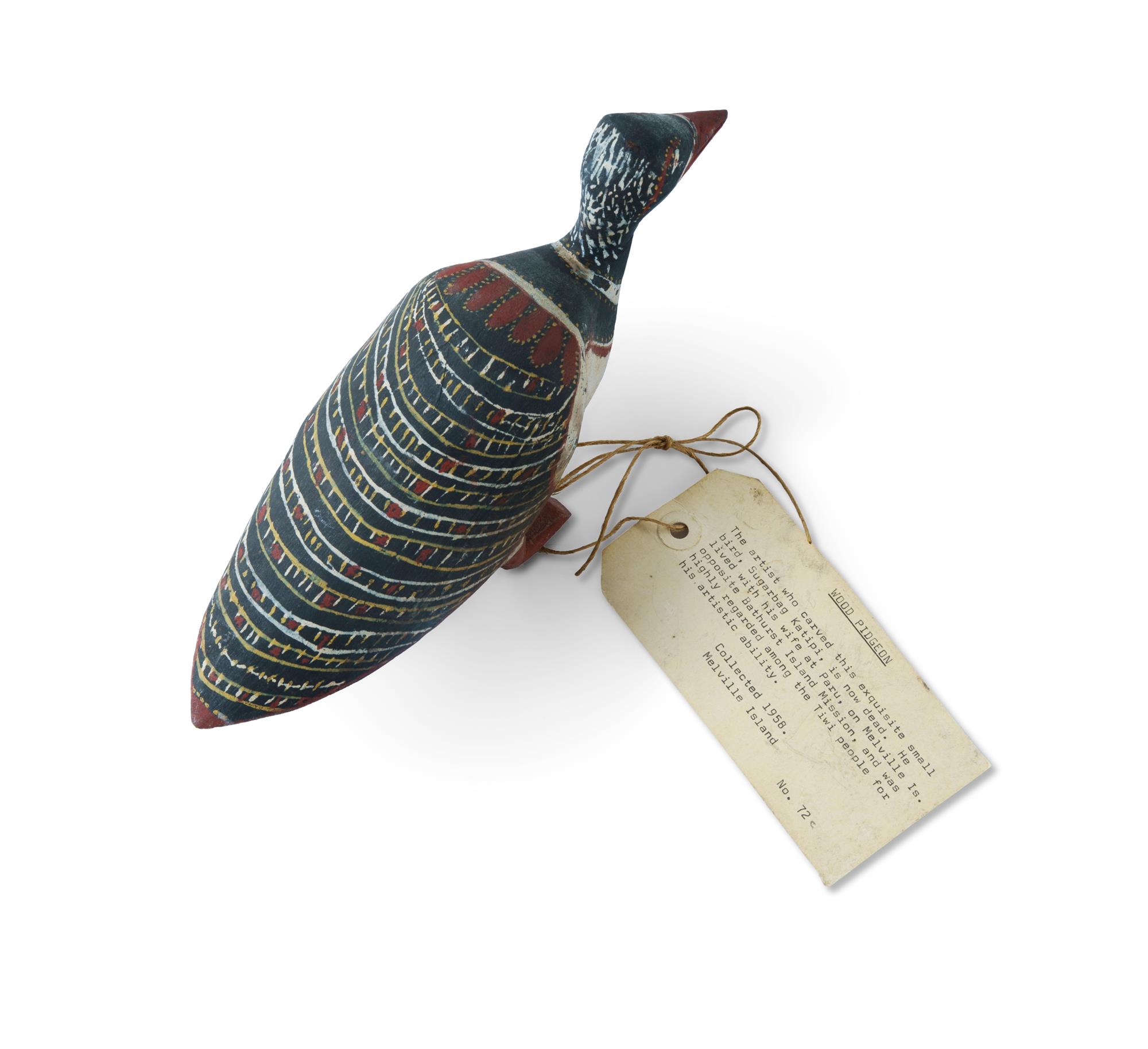 WONAMMERI, Sugarbag Katipi (Aboriginal c.1917-1977) 'Wood Pigeon' Melville Island, c.1958. Natural Earth Pigments on Wood H13cm, L25cm PROVENANCE: Collection Mr H & Mrs P Wallace, Sydney.Estimate $1,500-2,500