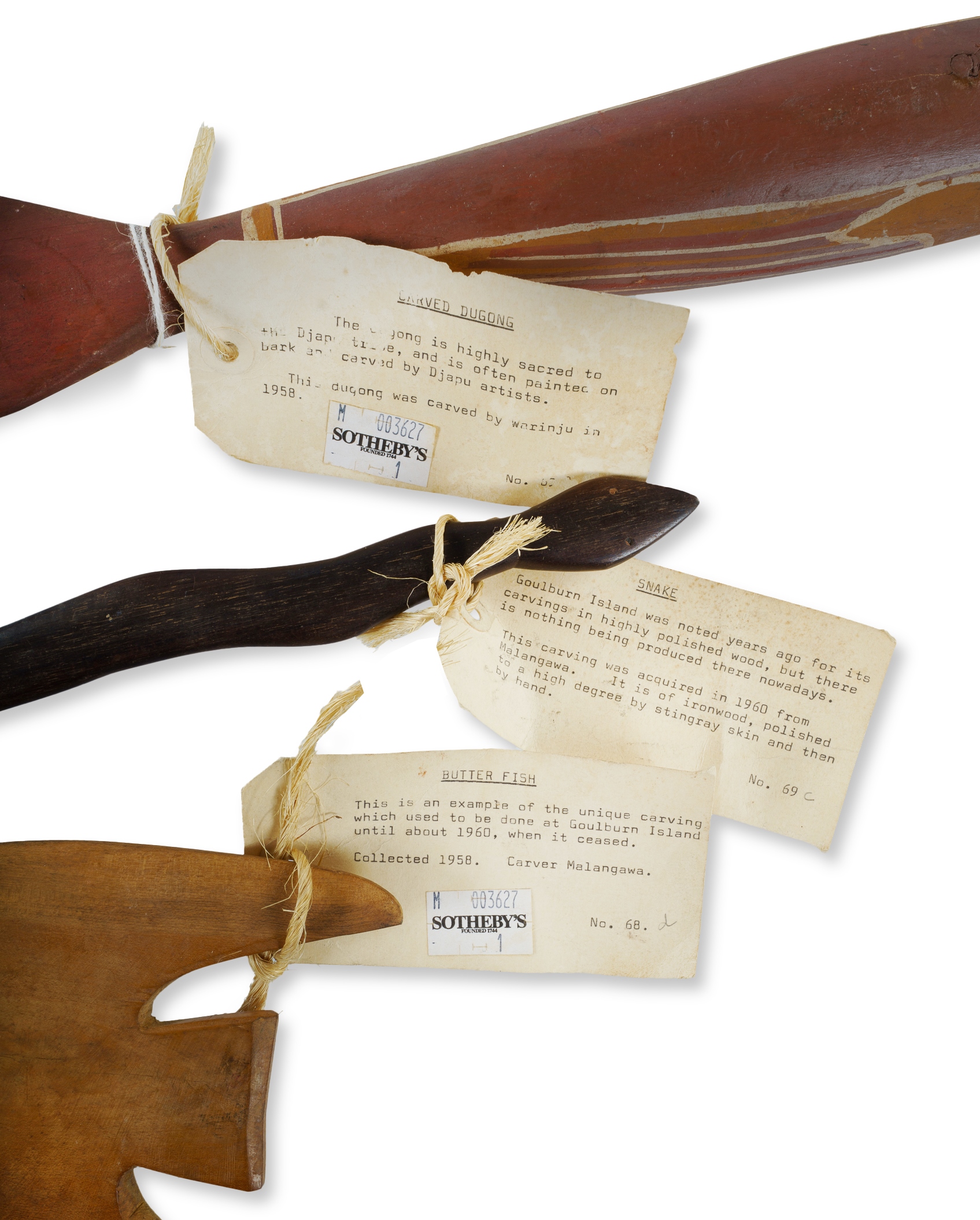 Djapu Clan Ironwood Carving of a Dugong, 1958. Together with two Goulburn Island carvings, 'Snake' and 'Butterfish' Ex Sotheby's. L43cm (dugong) L46cm (snake) PROVENANCE: Collection Mr H & Mrs P Wallace, Sydney.Estimate $400-600