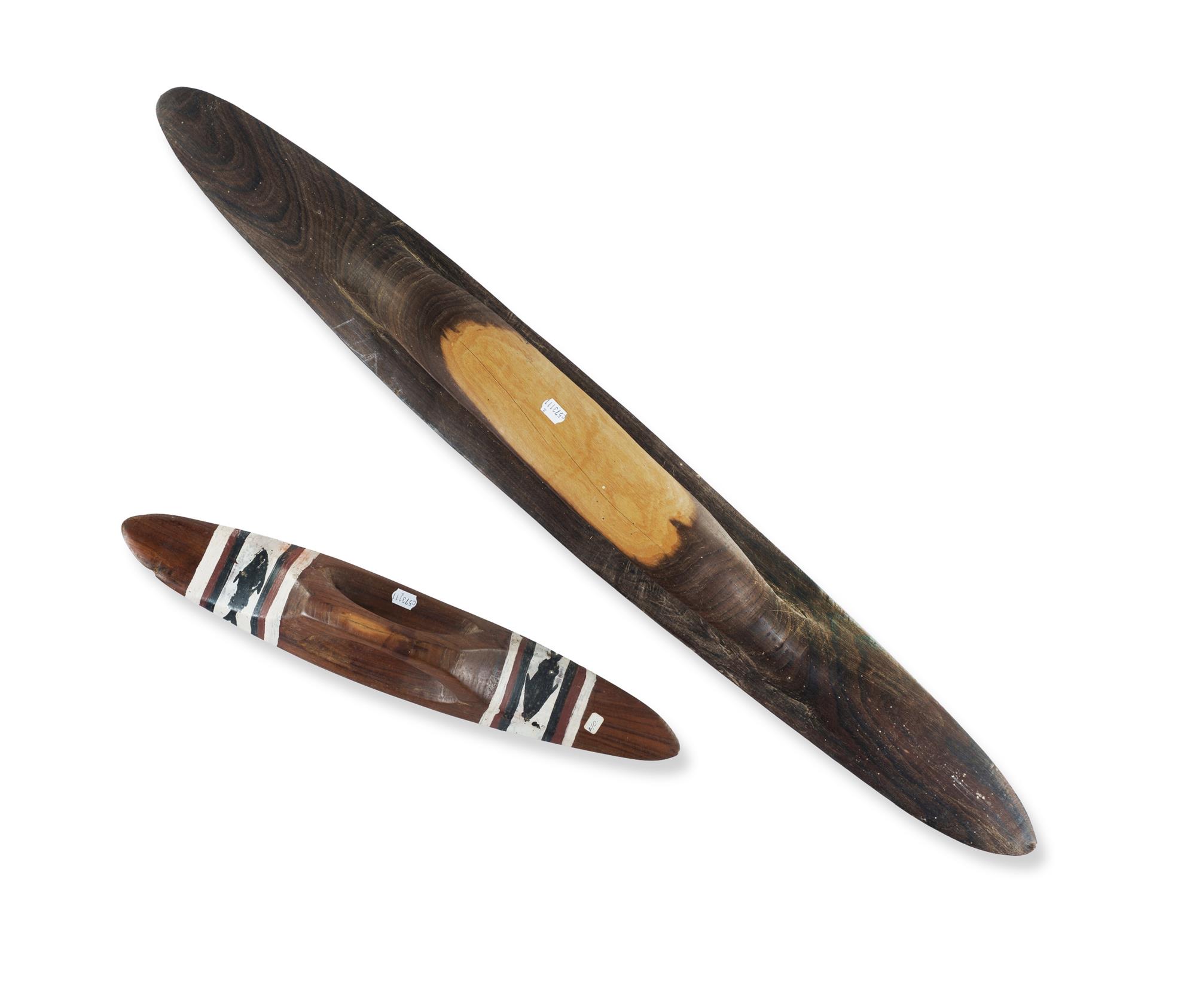 Two Tiwi Hardwood Shields One decorated with fish in natural earth pigments. (L80cm, & 41cm) PROVENANCE: Collection Mr H & Mrs P Wallace, Sydney.Estimate $250-450