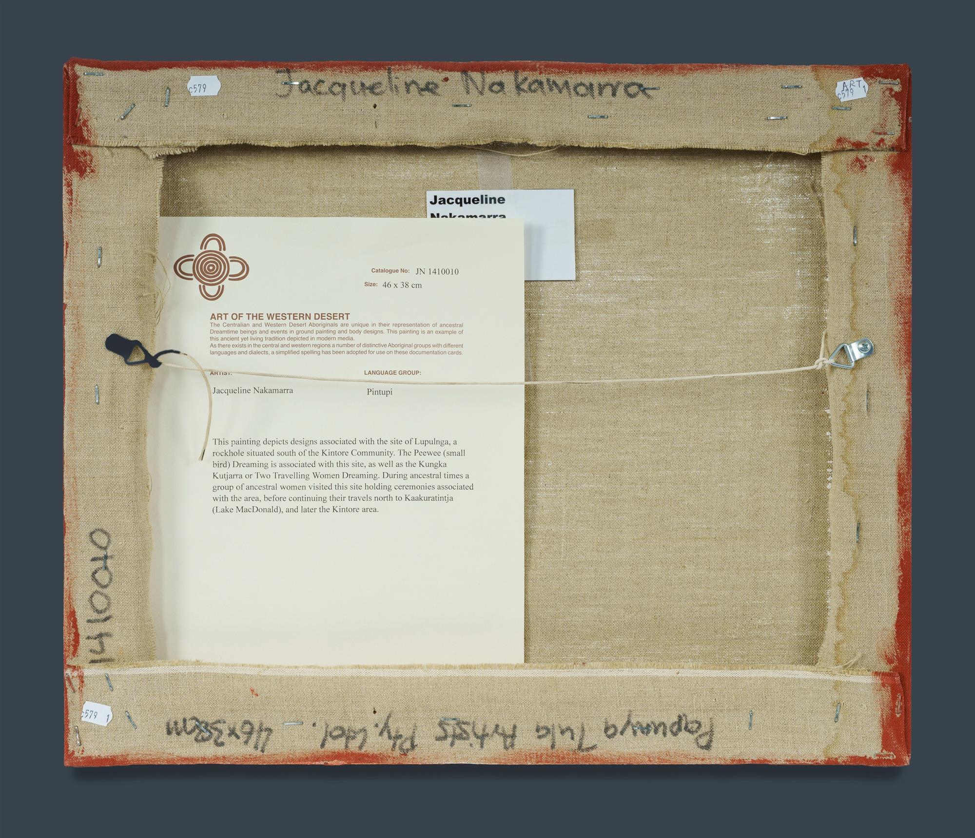 NAKAMARRA, Jacqueline (Aboriginal b.1958) Lupulnga Rockhole, 2014. Acrylic on Linen 46x38cm PROVENANCE: Papunya Tula Artists, cat #JN1410010 (certificate included); private collection, Sydney.Estimate $250-450