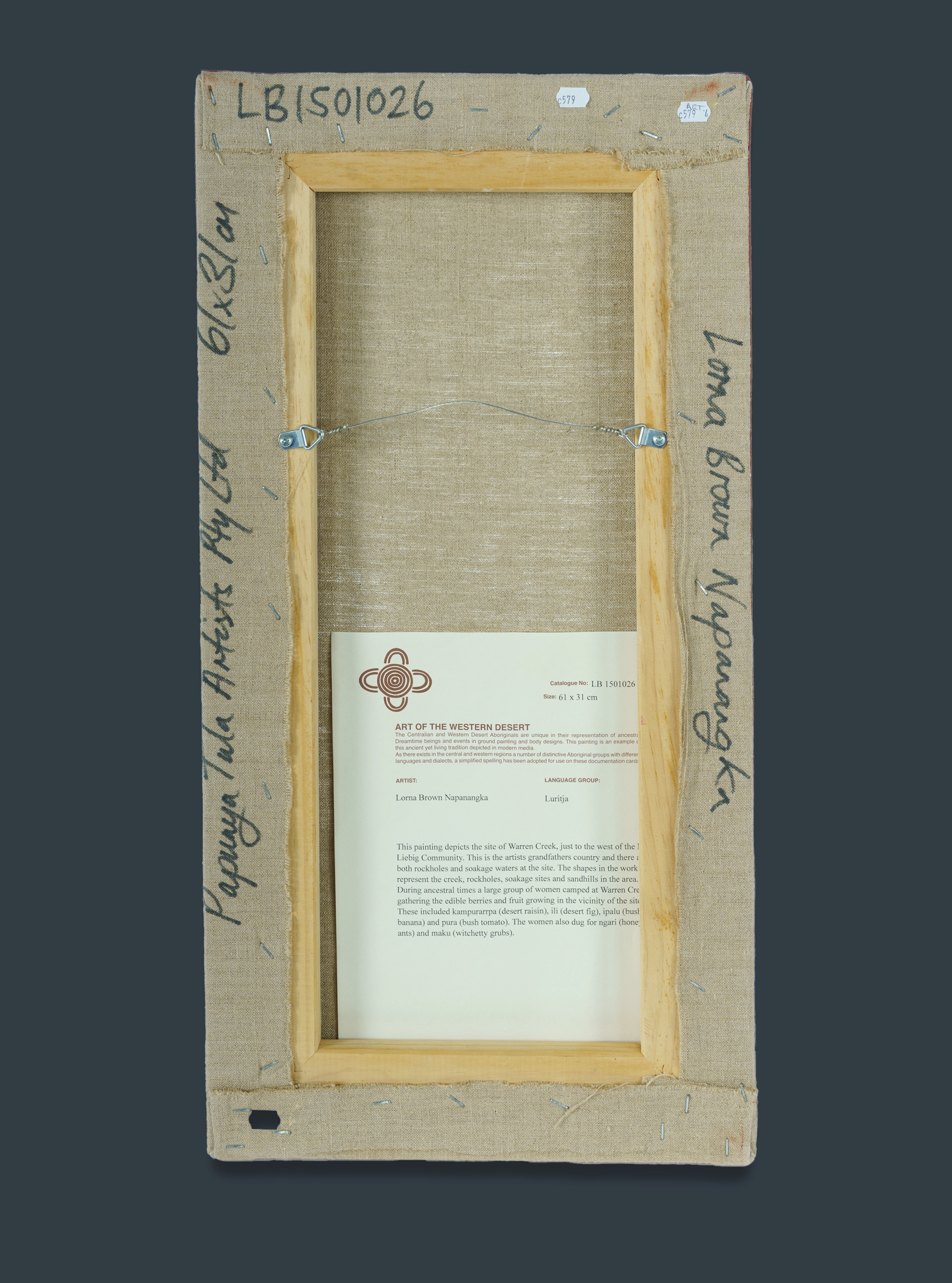 NAPANANGKA, Lorna Brown (Aboriginal born c.1965) Warren Creek (Grandfather's Country), 2015. Acrylic on Linen 61x31cm PROVENANCE: Papunya Tula Artists, cat #LB1501026 (certificate included); private collection, Sydney.Estimate $300-500