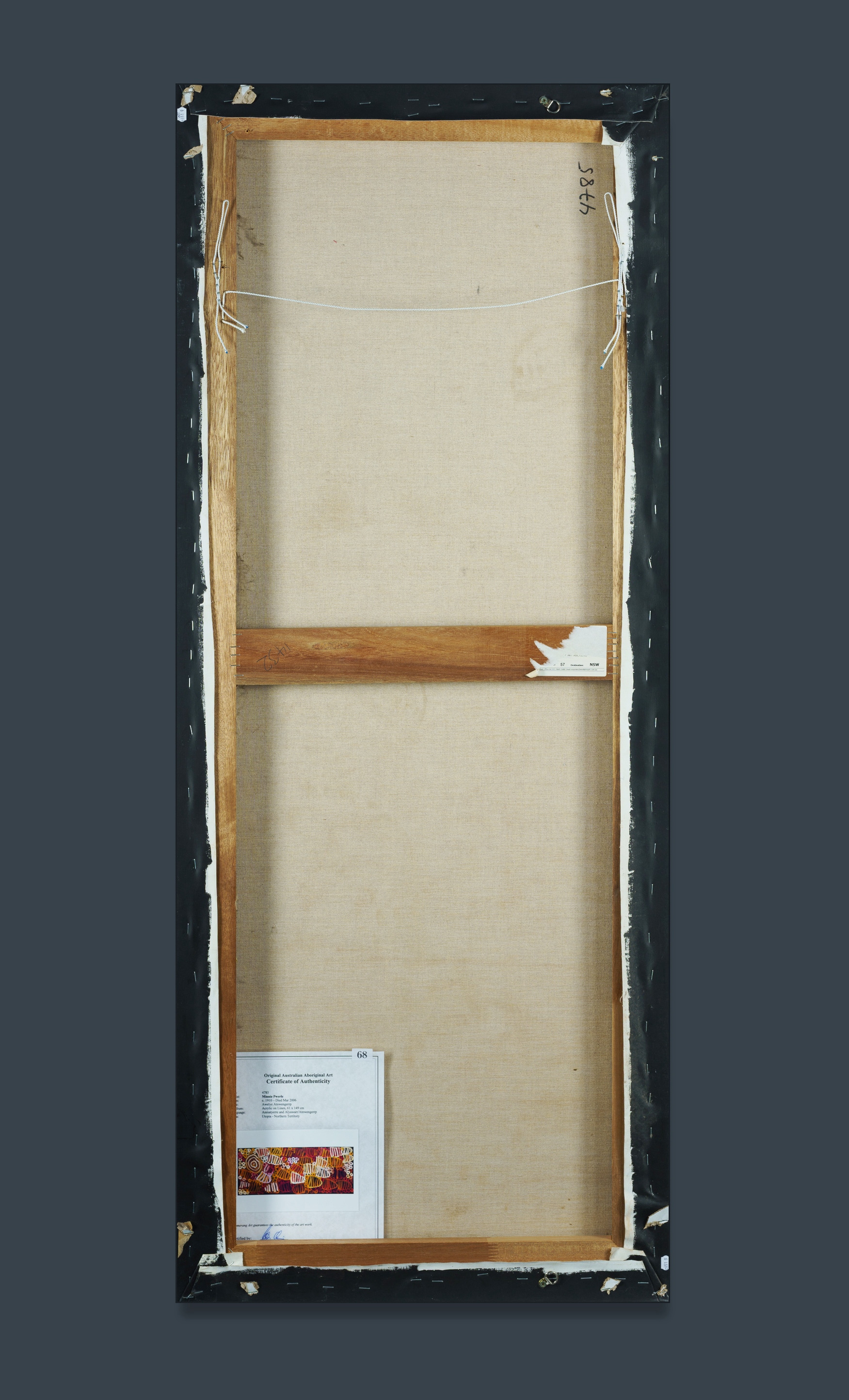 PWERLE, Minnie (Aboriginal 1922-2006) 'Awelye Atnwengerrp' Acrylic on Canvas 151x61cm PROVENANCE: Boomerang Art, Adelaide/Alice Springs, cat #4785 (certificate of authenticity included)Estimate $3,000-4,000