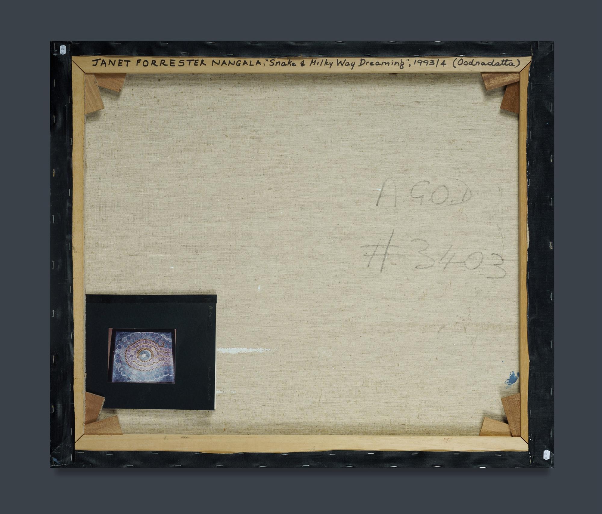 NGALA, Janet Forrester (Aboriginal b.1954) 'Snake and Milky Way Dreaming,' 1993-94. Acrylic on Canvas 92.5x79cm PROVENANCE: Aboriginal Gallery of Dreamings, Melbourne, cat #3403 (certificate included); Collection Mr H & Mrs P Wallace, Sydney.Estimate $200-400