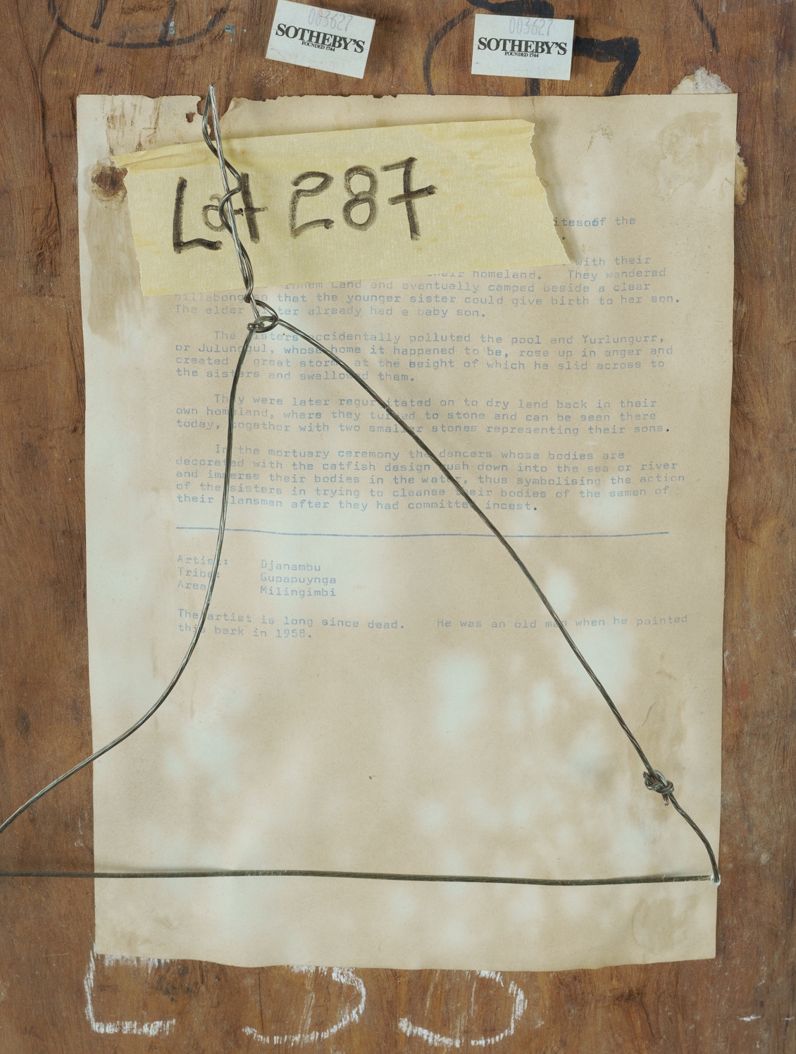 OTHER NOTES: According to the accompanying documentation this painting was collected at Milingimbi in 1958. The documentation reads in part: 'The catfish dance: is part of the mortuary rites of the Gupapuynga tribe and relates to the Wawilak (sic) myth.