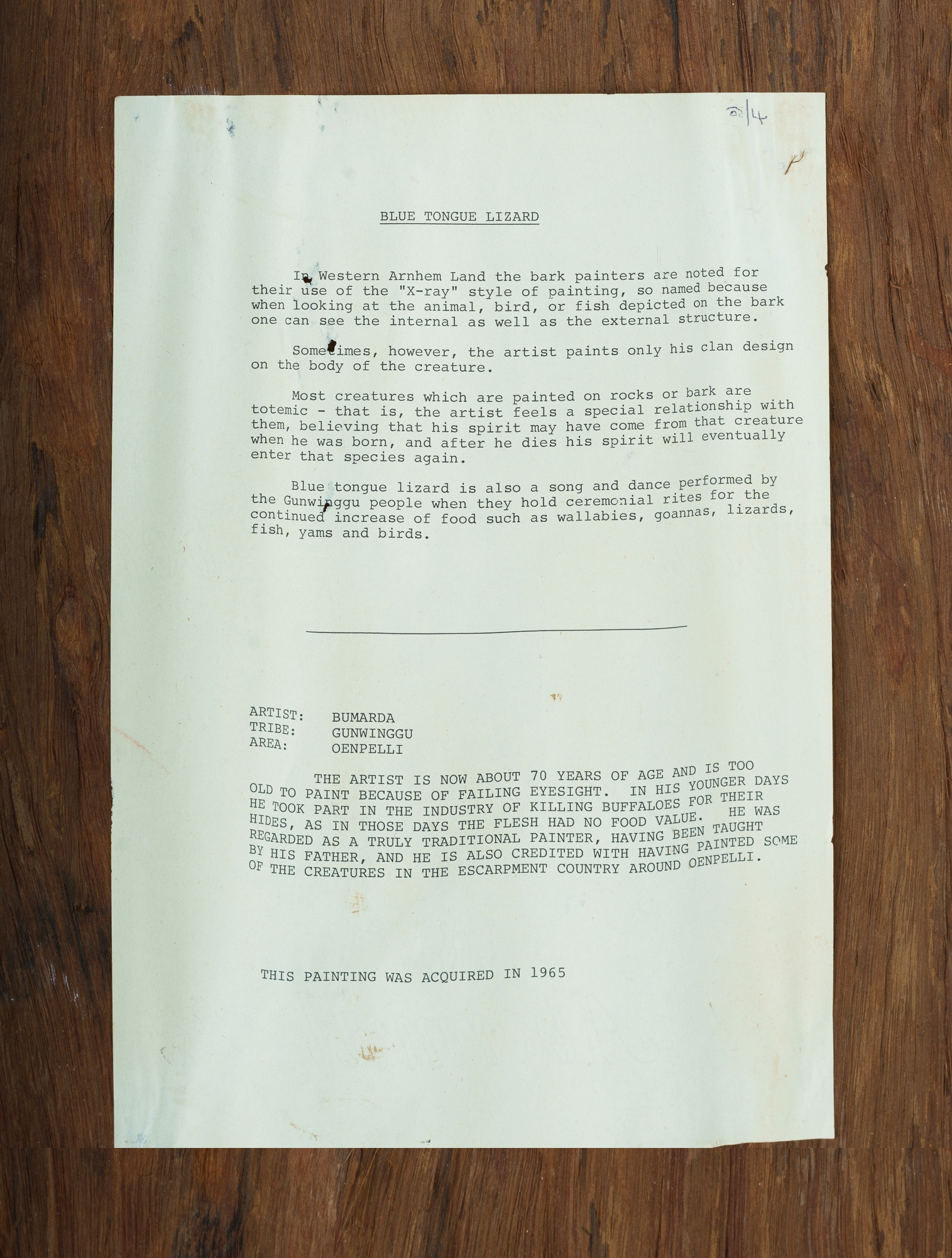 YANYURR, Bob Bumarda (c.1905-?) 'Blue Tongue Lizard' c.1965. Dorothy Bennett collection (possibly no.105) Natural Earth Pigments on Eucalyptus Bark 74x41cm PROVENANCE: Dorothy Bennett, 1965; Collection Mr H & Mrs P Wallace, Sydney.Estimate $500-800
