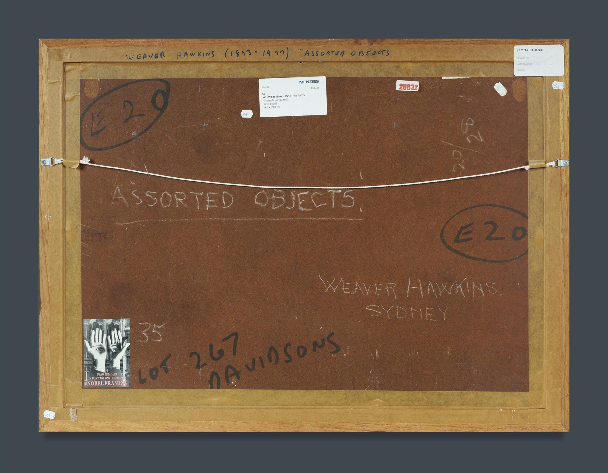 HAWKINS, Harold Weaver (Raokin) (1893-1977) 'Assorted Objects,' 1963. Signed and dated lower right 'Raokin 63' Oil on Board 49.5x69.5cm PROVENANCE: Hawkins family; Davidson Auctions, December 12th 2009 (lot 267); private collection, Qld; Leonard Joel, Melbourne, September 5th 2017 (lot 130); private collection, Qld.Estimate $1,500-3,000