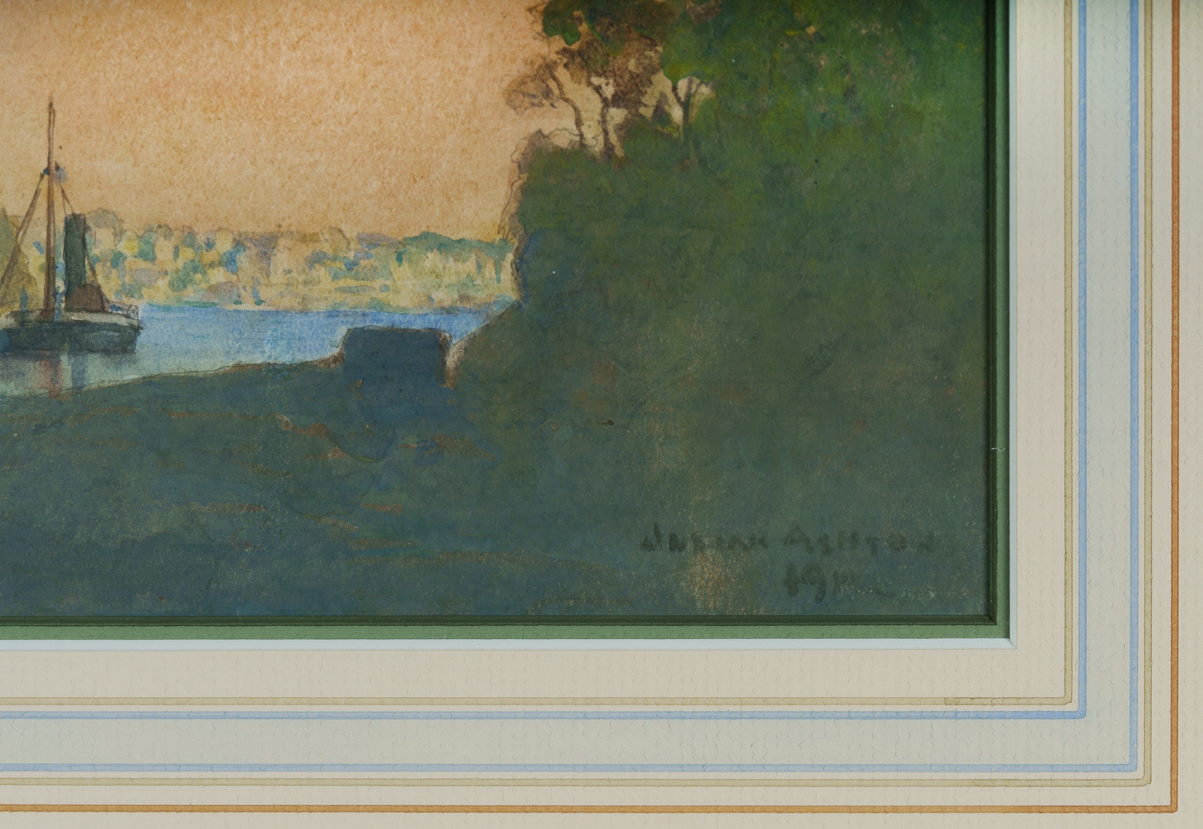 ASHTON, Julian Rossi (1851-1942) Sydney Harbour Signed lower right, and dated indistinctly (191?) W/Clr 12x32.5cm PROVENANCE: Macquarie Galleries; Leonard Joel, Melbourne, April 16th 1999 (lot 4); private collection, Sydney.Estimate $1,000-2,000