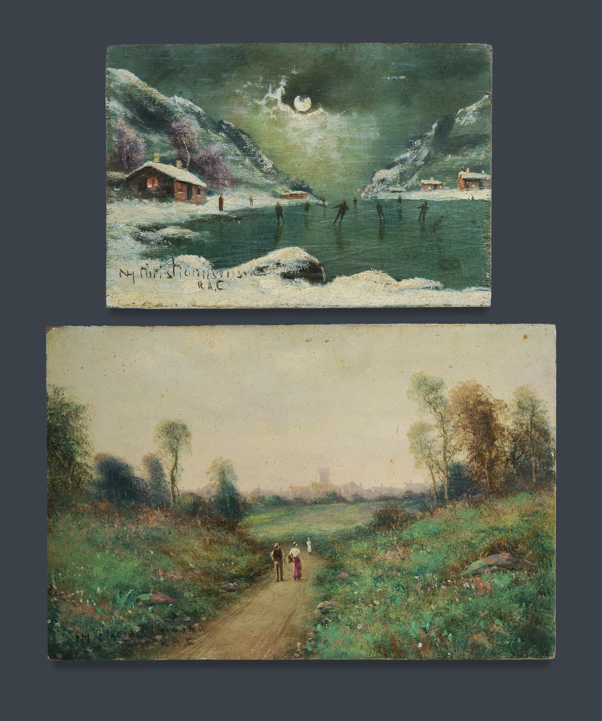 CHRISTIANSEN, Niels H (Danish 1850-1922) (4) Path to a Village, signed lower left (15.5x23cm); and Moonlight Skaters, signed lower left (12x17cm); and Two Village Scenes, Nocturne and Sunset, both signed lower right (23x15cm each) Oil on Board (4)Estimate $150-200